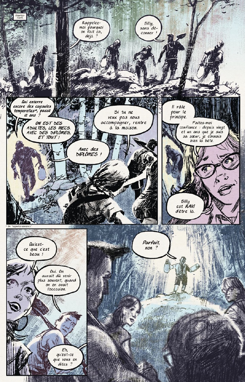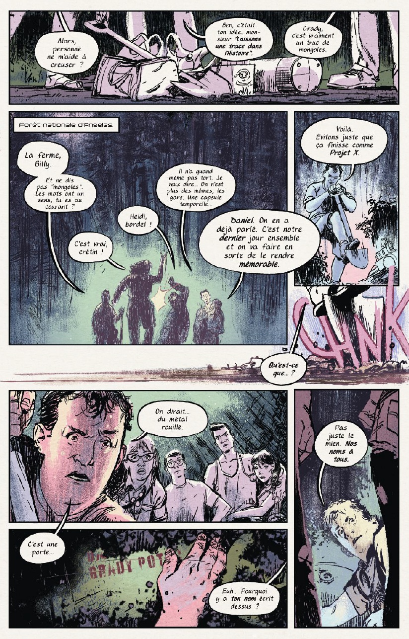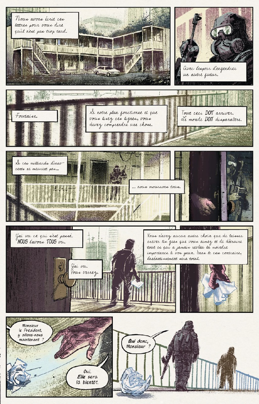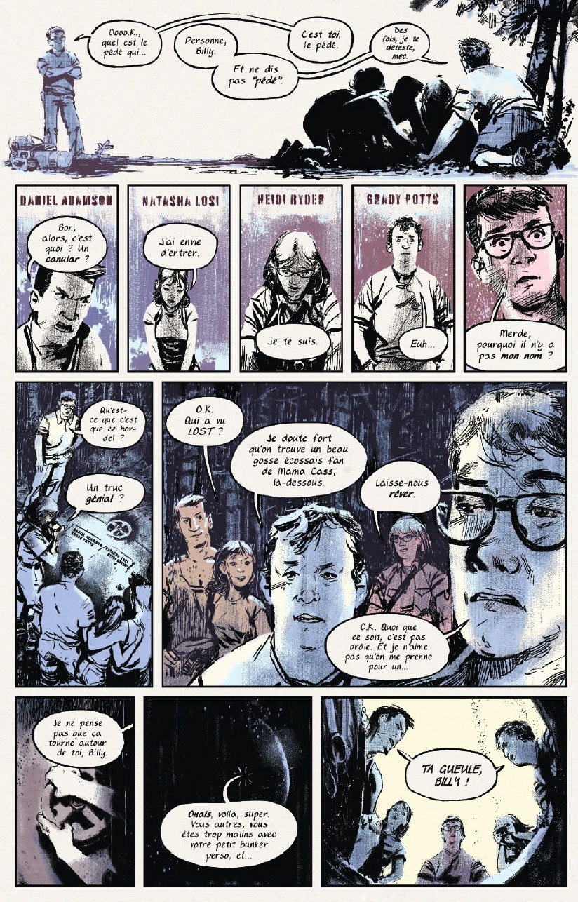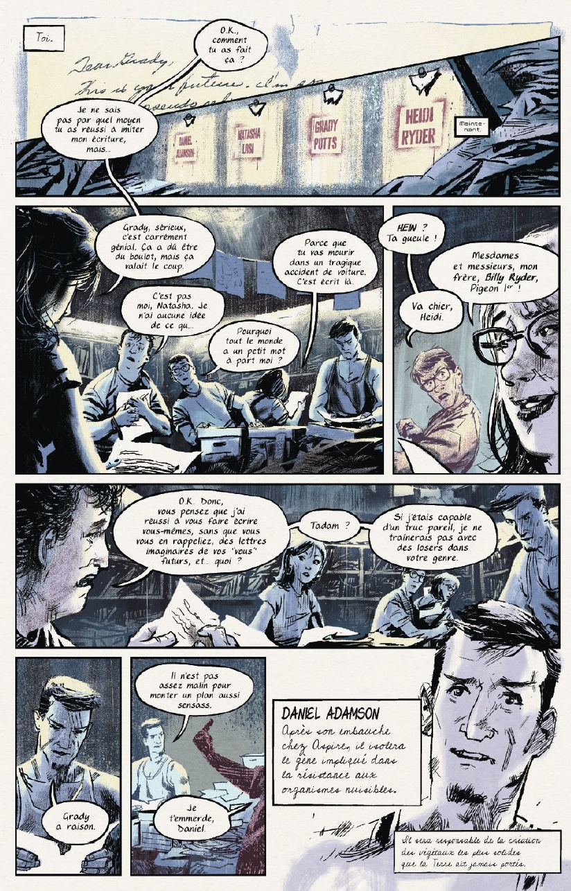D’ailleurs, celui-ci est plutôt simple, Et si vous étiez responsable de la fin du monde …. Voilà qui va déjà en attiré plus d’un, The Bunker lance dès la première page le sujet sur la table et nous met face à la réalité en peu de page. Nous nous retrouvons en compagnie de 5 personnages principaux qui après avoir découvert un bunker plutôt étrange se retrouve face à des lettres écrient par leurs futurs eux … Aiie ça y est, nous en avons perdu plus d’un avec cette dernière phrase ! Vous l’aurez compris dans Capsule temporelle – The Bunker, vous serez ballotté entre présent et futur, l’un devra influencé l’autre sans pour autant dévier de ce qui s’avère nécessaire au futur. Ce mélange va nous tenir en haleine jusqu’au bout. Chaque personnage connait un bout de l’histoire, son histoire, sans en dévoiler le contenu à son voisin, ils vont avancer et tenter de comprendre ce qu’il se passe. Mais les choses vont par conséquent allez bien plus vite que ce qu’ils prévoient, et que serai un voyage dans le futur si il ne marchait que dans un sens et pour un papier…