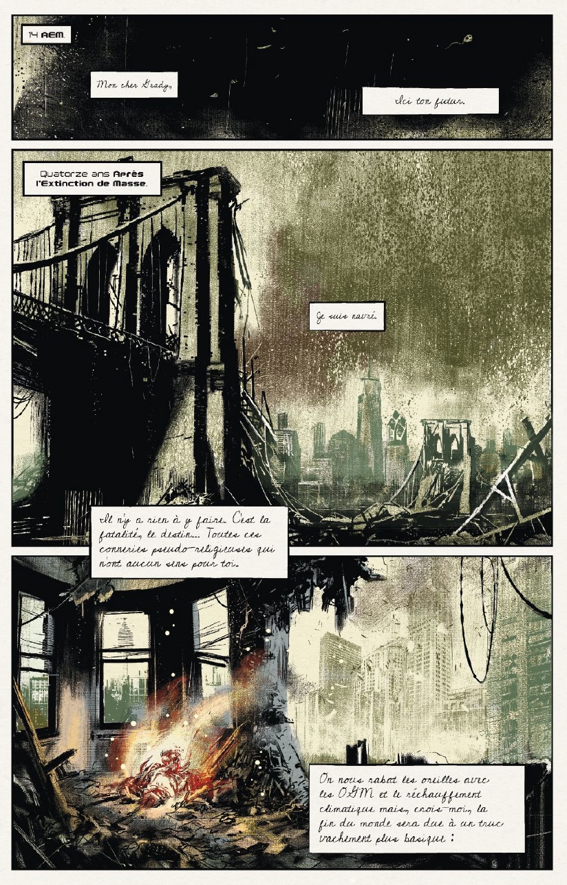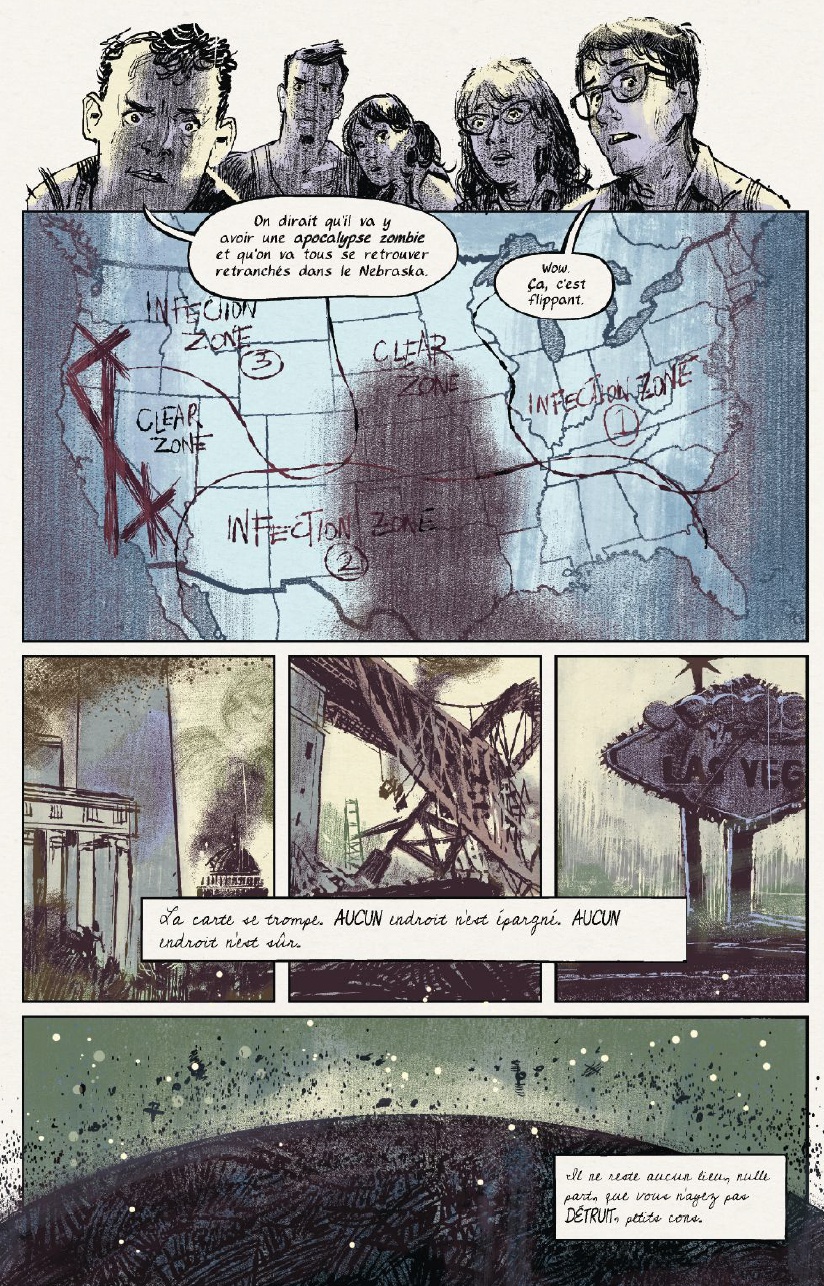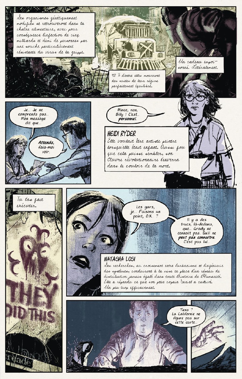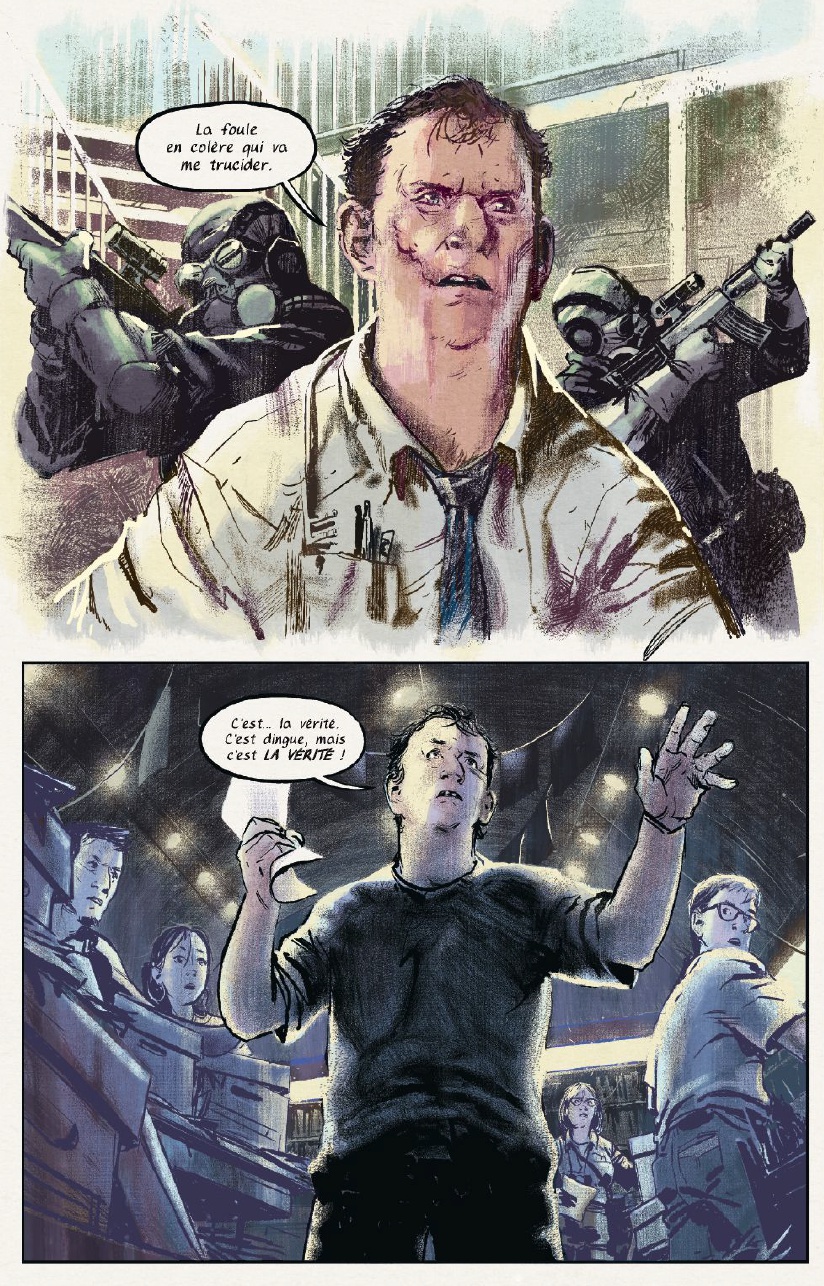 The Bunker est un vrai comics de science-fiction, thriller comme nous les aimons. Arf, je dois quand même vous avouer que le dessin que je trouve splendide, va en rebuter plus d’un et pourtant cet effet brouillon et mal entretenu que Joe Infurnari nous livre ici mérite quand même que vous vous y penchez! Les cases sont bien découpées et celles-ci sont somptueuse. The Bunker a tout d’une grande série, attendons quand même avant de lui donner les lauriers, il va être difficile de mélanger les effets qu’auront les choix de ses personnages sur le futurs sans se perdre dans un brouhaha scénaristique. Espérons que tout cela n’est pas lieu et que nous nous retrouvions face à une série qui nous tiendra en haleine jusqu’à la fin !