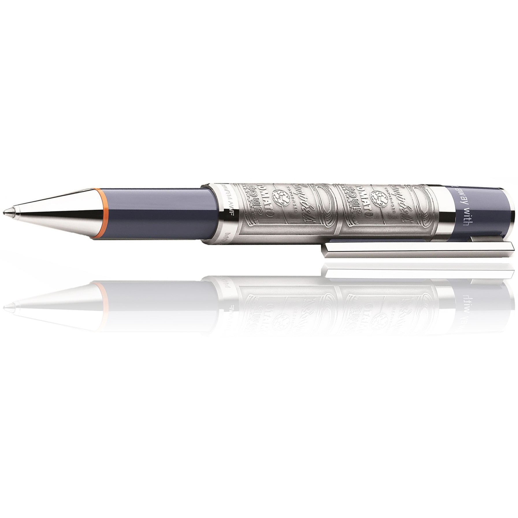 D’un bleu cobalt le corps se marie à merveille avec l’anneau orange situé sur le col du stylo, l’aggrafe rend un hommage à la raclette, l’instrument nécessaire à la sérigraphie et le capuchon est divinement décorer avec l’oeuvre la plus emblématique de l’artiste, la fameuse boite de soupe! La plume en or fabriqué main est orné d’un dollars et la phrase « Art is what you can get away with » est inscrite autour du bouchon. Le tout unie pour former une pièce superbe, un objet qu’il nous faut dans notre quotidien pour ne pas oublier que l’écriture est un art !