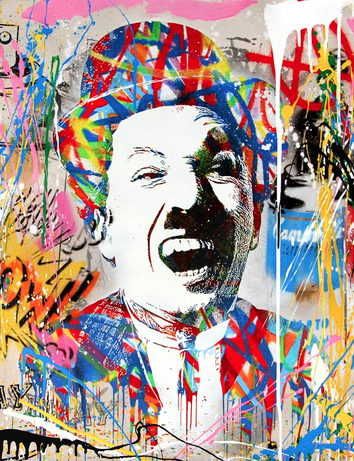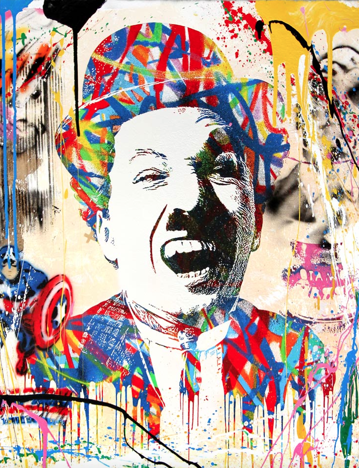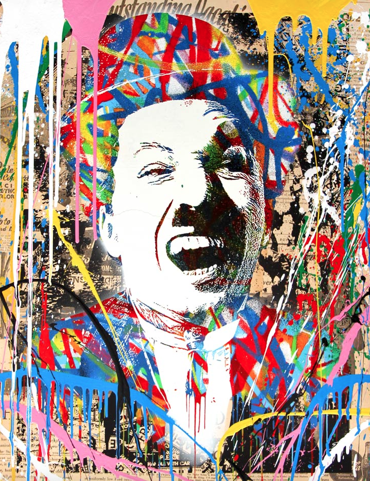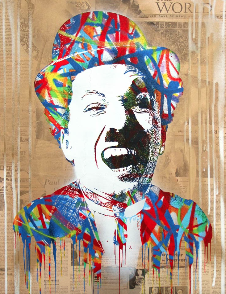 Et aujourd’hui encore je vois passer dans mes mails, une vente de Mr Brainwash comme toutes les fois depuis déjà bon nombre d’années, je me jette sur la vente pour en faire l’acquisition et là bim bam boum, SOLD OUT ! Vous n’imaginez pas la frustration que je ressens à chaque fois. Et pourtant regardez de plus prêt, prenez pour aujourd’hui l’image d’une icône du cinéma muet, Charlie Chaplin par exemple.. Jetez de la peinture dessus, posez quelques images par ci par là et bis un Brainwash. Voilà ce qui fait tout cet artiste. Il sait fait n’importe quoi, s’en en avoir quelque chose à faire et il crée quelque chose de cool et funky !