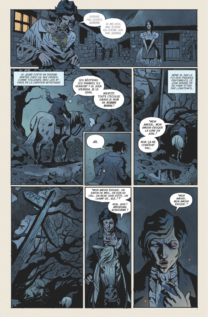Revenons en à notre comics, vous l’aurez donc compris, Robbie Burns est donc un personnage qui a marqué les siècles et qui encore aujourd’hui inspire. Nous le retrouvons donc ici projeté dans la peau d’un chasseur de sorcières. Etrangement notre pensée première nous ramène à tous ces Abrahams Lincoln contre les vampires etc… Mais il n’en est rien ici, le scénario de Gordon Rennie & Emma Beeby est très bon et nous emmène très vite à l’essentiel, le tout ponctuer de dialogues totalement fabuleux, mélangeant tirades et poésie. Un petit chef d’oeuvre lorsque l’on aime le travail de Robert Burns …