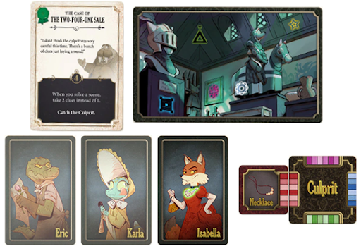 Vous allez donc enchaîner les cartes scène pour gagner des indices et ainsi éliminer des cartes suspect jusqu’à ce qu’il n’en reste qu’une, et normalement si vous avez bien géré, la carte qui reste désigné le coupable. Vous retournez alors la tuile coupable et si elle correspond à la carte qui vous reste, bravo, vous avez trouvé le coupable !!