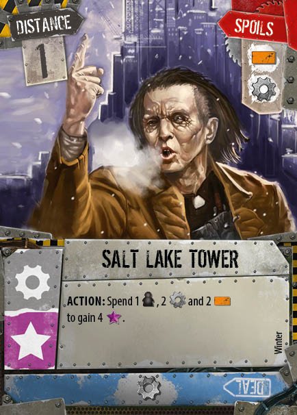 Tout comme pour Settlers, le matériel est de très bonne qualité, toutes les ressources sont en bois sculptées, et ça en jette, 4 plateau perso qui représentent les 4 factions du jeu, 200 cartes de très bonne qualité et bien illustrées, des jetons … bref pas mal de matos. Pour ce qui est des illustrations, ça fait envie, déjà le thème Post Apo fait son petit effet, bien plus que le gentil petit bonhomme de Settlers, les cartes sont justes magnifique, pleines de détails, bref c’est du très beau boulot. C’est tout un collectif qui est à l’origine des illustrations du jeu, et la liste est longue, donc je vais vous épargner la lecture de cette longue liste.