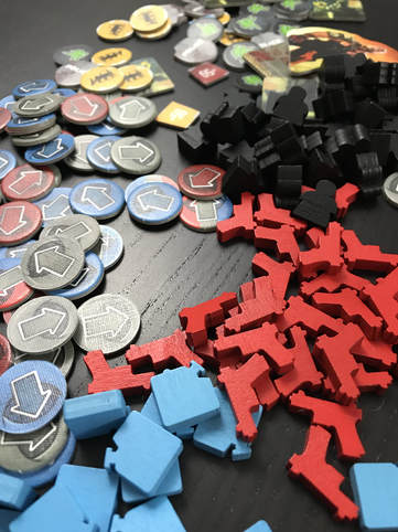 Ensuite pour le placement des cartes, on n’utilise plus de ressources, mais des jetons « contact », chaque carte a une icône de distance allant de 1 à 3, et selon la distance il faudra dépenser des jetons « contact » en conséquence. Et les jetons « contact » ne sont pas simple à avoir, il faudra utiliser les lieux de production ouvert des autres joueurs, ou faire une razzia chez les autres.