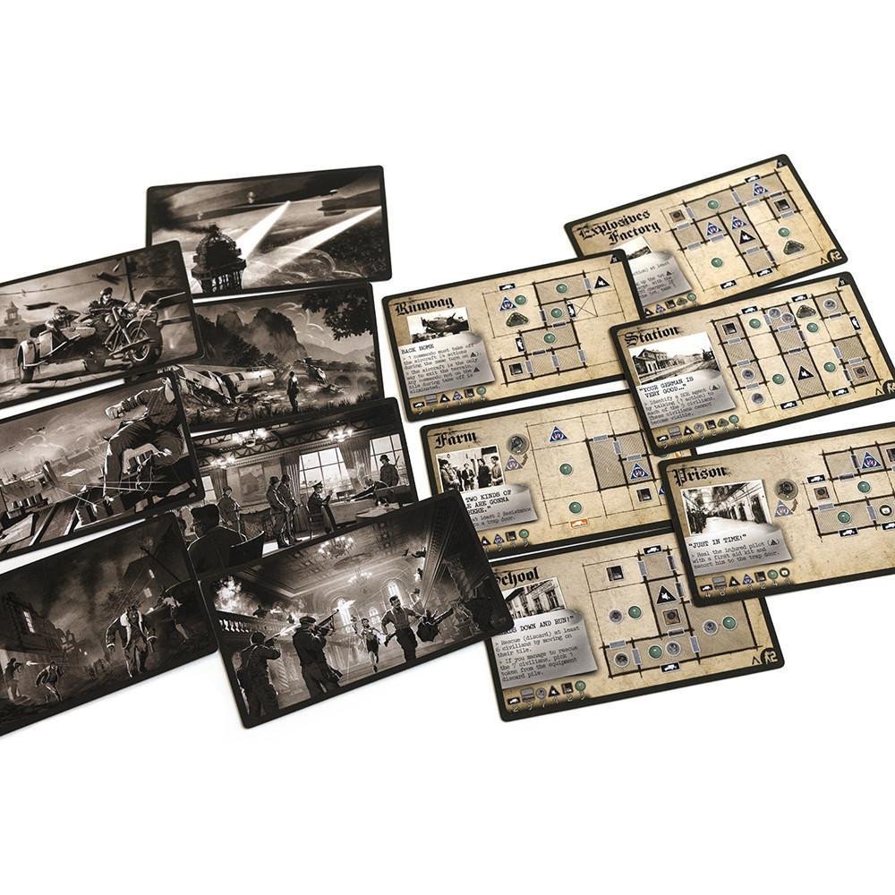 - La phase ennemie : durant cette phase les ennemis sont activés. Dans un premier temps les renforts arrivent sur les tuiles où sont des pions renfort, à hauteur d’une unité ennemi par pion renfort, et 2 si l’alarme est activée. Ensuite les ennemis se déplacent, soit vers le ou les commandos visibles, soit dans la direction indiquée sur la carte événement tirée en début de tour. Et les ennemis finissent par tirer sur les commandos visible à porté.