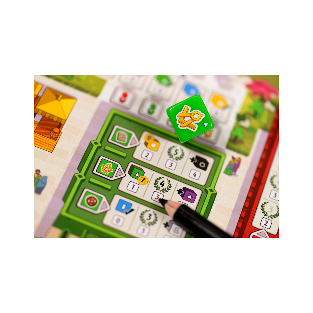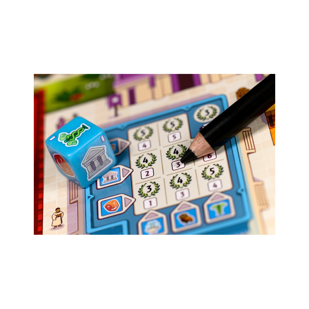 La mise en place est simple, chaque joueur prend 1 plateau, 1 crayon; on place le forum avec les 7 dés de départ au centre de la table et tout le monde est prêt à jouer !