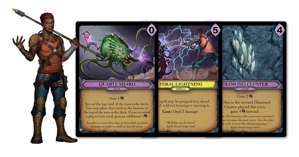 • Phase principale : c’est durant cette phase que vous allez jouer les cartes de votre main, sachant que vous commencez toujours un tour de jeu avec 5 cartes en main. Donc durant votre tour vous allez jouer des cartes, des gemmes qui vous donnent de l’éther (la monnaie du jeu) qui va vous permettre d’acheter de nouvelles cartes qui iront dans votre défausse. Vous pouvez jouer des sorts que vous placerez sur des brèches ouvertes, ou des brèches fermées mais stabilisées. Vous pouvez, pour 2 éther vous pouvez prendre un pion charge qui permettra d’activer la capacité spéciale de votre personnage, vous pourrez stabiliser une brèche, ce qui vous permettra de lancer un sort supplémentaire, mais aussi de réduire le coût d’ouverture de cette brèche. Il est bien évidemment possible de préparer des sorts, pour votre prochain tour, et il est essentiel de préparer des sorts, puisque c’est ce qui va vous permettre de taper sur la Nemesis et ses serviteurs.