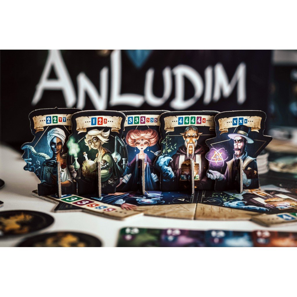 Dans une boite de Anludim il y a 1 plateau de jeu en 5 partie, 5 blasons de Coven, 65 cartes, 5 pions professeur, 30 pions objets magiques, et c’est tout et c’est deja pas mal. Le tout est de très bonne qualité, tout comme les illustrations qui sont très réussis, mais trop peu nombreuses et c’est bien dommage. Quoi qu’il en soit c’est Anne Heidsieck qui s’y est collée.