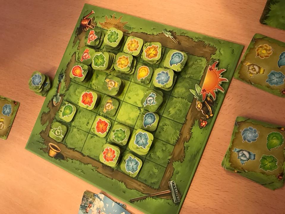 La mise en place est hyper simple, on place le plateau au centre de la table, chaque joueur se munie de son plateau personnage, ainsi que des fleurs qui correspondent, chaque joueur reçoit entre 5 et 10 cartes (tout dépend du nombre de joueurs) qu’ils placent face cachées devant eux.