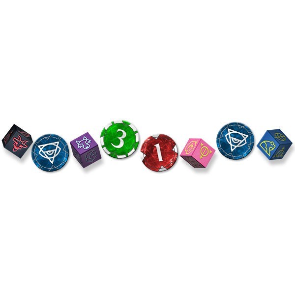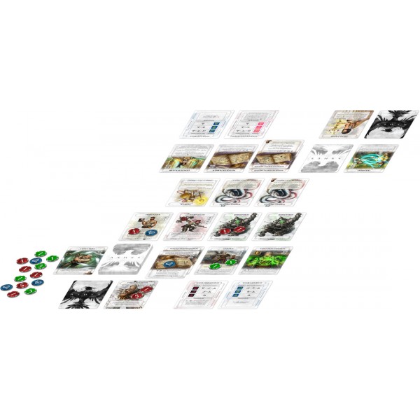 On commence par la boite qui est massive, les illustrations sont juste magnifiques et donnent très envie. Elles sont signées Fernanda Suarez, j’ai eu limite envie d’acheter le jeu juste parce que la boite est belle (oui je sais je suis très superficiel …). En termes de contenu 6 decks pré-construits, correspondants aux 6 Héritiers de la boite, 40 dés spéciaux, et des jetons. Certains râleront peut être sur la taille de la boite, qui peut paraître énorme par rapport au contenu, mais 2 extensions sont sorties en même temps que la boite, et d’autres vont sûrement suivre, et au final la taille de la boite se révélera adéquat.