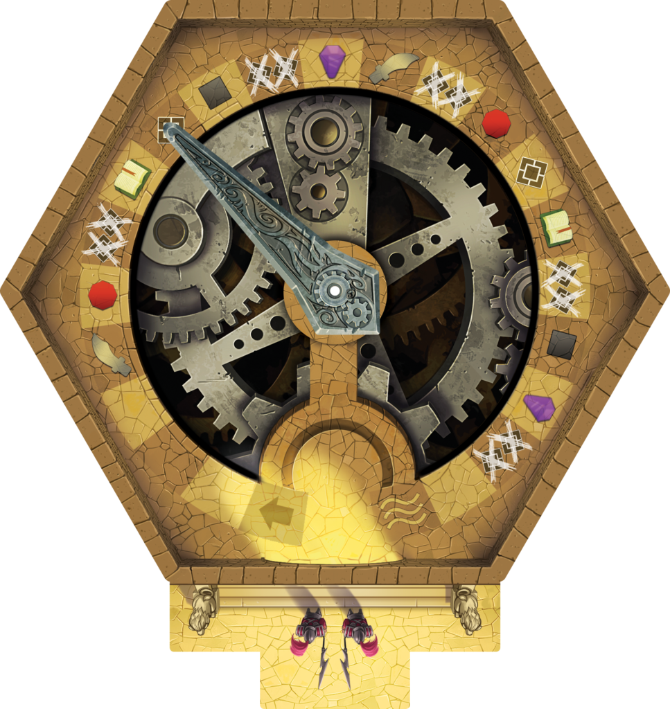La fin de la partie est déclenchée lorsque l’aiguille arrive à la dernière case du cadran. Pour chaque ressource on va regarder qui en possede le plus, et le joueur majoritaire prend 3 points de victoire, et les seconds 1 point, on ajoute à tout ça, les tuiles et le joueur qui a le plus de points remporte la partie.