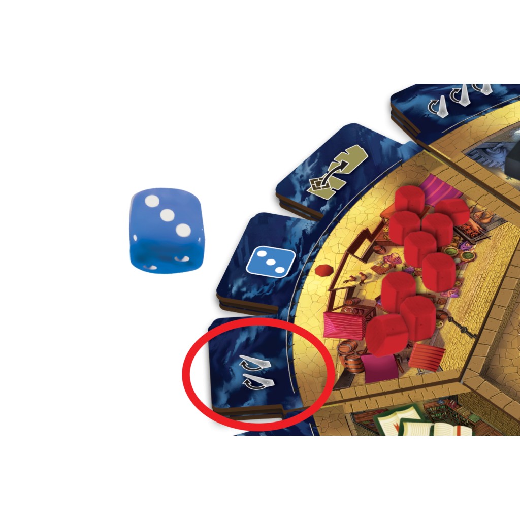 • Avancée de l’horloge : une fois que les joueurs ont tous récupérés 2 dés, il reste 1 dé. On regarde sur le quartier où se trouve ce dé combien de symbole aiguille il y a et on fait avancer l’horloge en conséquence. L’horloge peut déclencher des évènements, tel que l’inventaire, à ce moment là, le joueur qui le plus de la ressource indiquée par l’aiguille prend 1 point de victoire. Lorsque que l’évènement « Don » est déclenché, chaque joueur peut dépenser 2 ressources pour gagner 2 points de victoire.