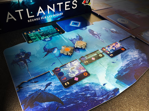Atlantes est un jeu de gestion de main, avec un petit coté deck building, ici pas de pions ressources, tout est géré avec l’exploitation des lieux et l’utilisation des mantas, c’est comme ça que vous allez cumuler pas mal de ressources. Donc c’est à vous de bien choisir les lieux que vous prenez, car ils vont clairement orienter vos prochaines actions, selon les ressources qu’ils apportent. Il y a aussi un coté « course à l’objectif » car le premier à se placer prend plus de points que les autres, et ça peut faire la différence.