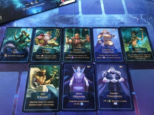 La mise en place est simple, vous placez le plateau au centre de la table et vous placez les cartes personnages sur les emplacement dédiés, pareil pour les cartes lieux. Ensuite chaque joueur prend un plateau joueur, et un deck de 6 cartes personnage et les 4 mantas de la couleur du personnage choisit.