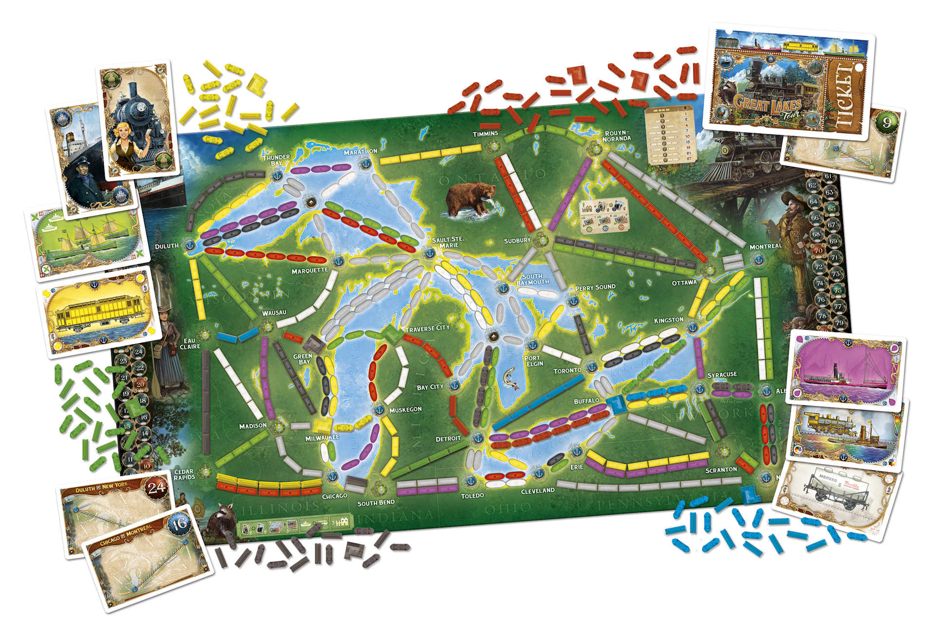 Pour les connaisseurs, pas de surprise, on retrouve quasiment le même thermoformage que sur les boites précédentes, les wagons de couleur, et la nouveauté de cette nouvelle boite, les bateaux, et le paquet de carte qui correspond. Il y a également le très grand plateau de jeu avec d’un coté la carte du monde, et de l’autre la région des grands lacs. Donc du bon matériel comme d’habitude chez Days of Wonder. Les illustrations sont toujours très chouettes, colorées avec un petit coté « old school », et sont signées Julien Delval.
