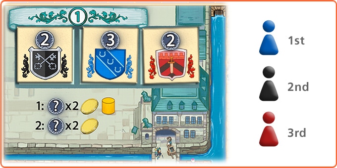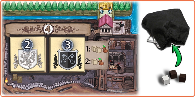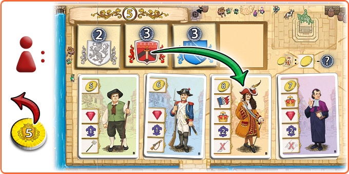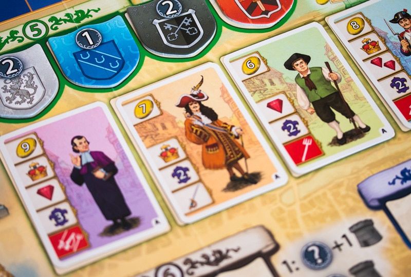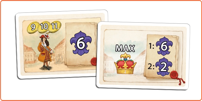 - Évaluer les drapeaux : Durant la partie vous avez pu récupérer des cartes de personnages, des paysans, des soldats et des nobles. Sur ces cartes il y a différents symboles, dont des drapeaux, le joueur qui possede le plus de drapeaux gagne le plus gros bonus du tour en cours. Il faut savoir qu’à chaque tour, le bonus est différent, ce qui change la strategie du tour.