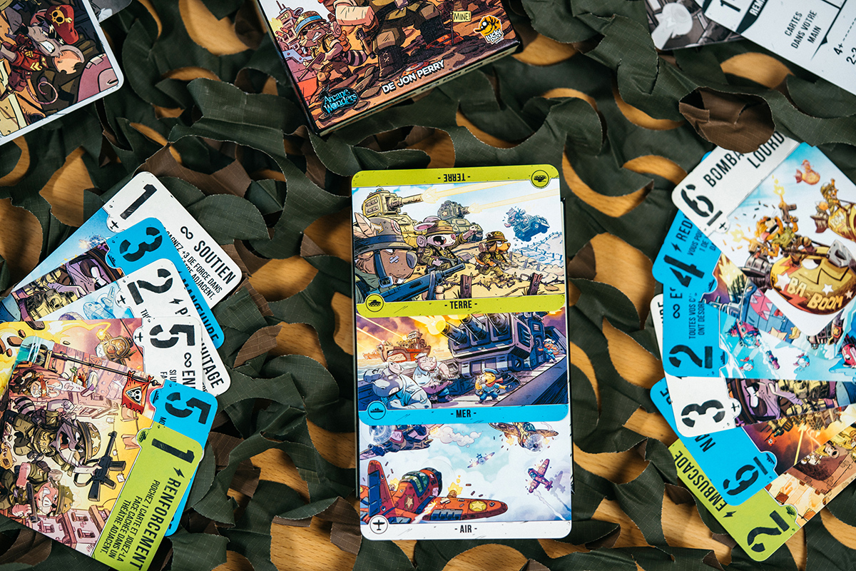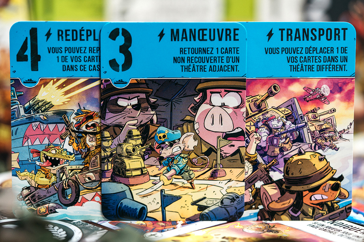 Chaque théâtre d’opération a une couleur, on a l’air la terre et la mer, et dans votre main vous avez des cartes de couleurs qui correspondent aux différents théâtres. Chaque joueur va donc jouer à son tour une carte sur un théâtre d’opération, les joueurs vont jouer des cartes et lorsque toutes les cartes ont été jouées ou quand un joueur s’est retiré la manche prend fin.