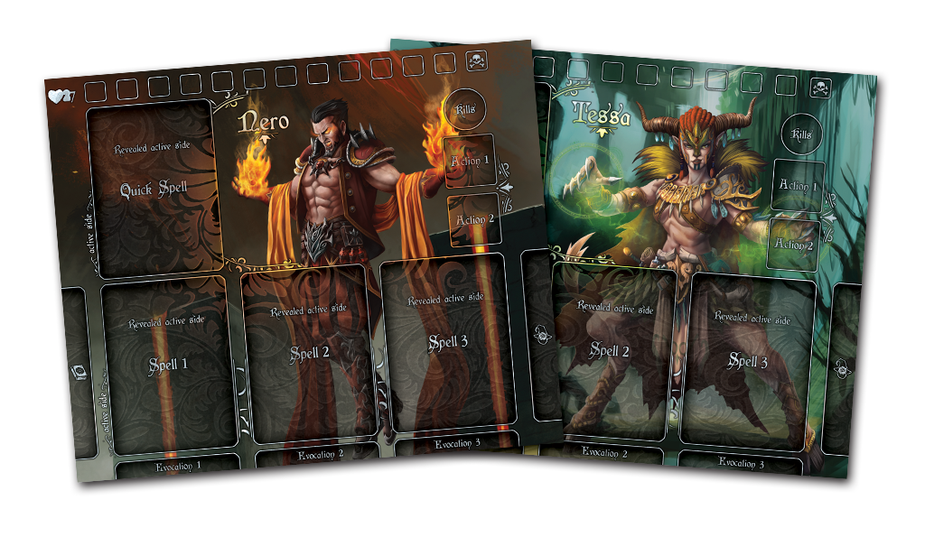 - Phase de préparation : Durant cette phase vous allez jouer entre 2 et 4 cartes de votre main, sur votre plateau, et face cachées. Il y a 4 emplacements de sort, un emplacement pour un sort rapide, ce sort ne tient pas compte de l’ordre de placement, et 3 emplacements de sort qui ne peuvent être joués que dans l’ordre. Le placement de vos sorts a donc une importance capitale