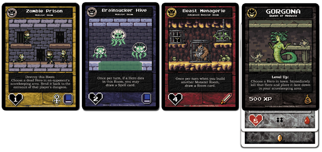 - La phase de construction : Chaque joueur pose, à tour de rôle, une carte salle, soit sur un emplacement vide (un donjon est composé de 5 cartes), soit sur une carte existante. Il existe des cartes salles avancées, qui sont plus puissantes, ces cartes ne peuvent être posées que sur des salles possédants le même symbole de trésors.