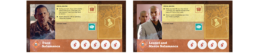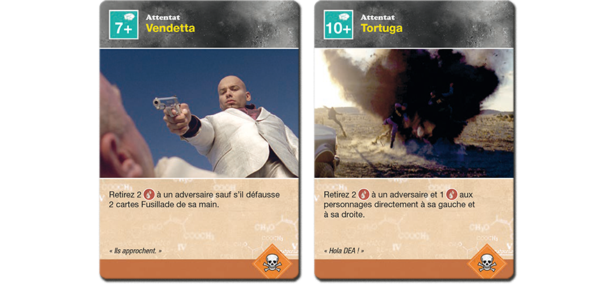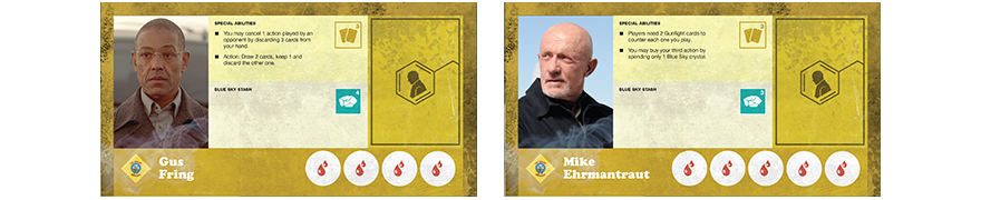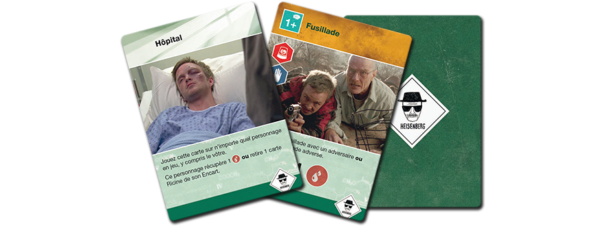 Le jeu étant basé sur la série, on retrouve autant sur la boite que sur les cartes du jeu des photos de la série, la boite fait envie, le camping car en plein désert avec la fumé bleu qui s’y échappe nous rappel avec plaisir la série, on imagine deja Walter White sortir en slip. Pour ce qui est des cartes du jeu, j’avoue que j’ai du mal avec les photos de la série, même c’est c’est sympa de retrouver les personnages de la série tels qu’on les a connu, je trouve ça toujours un peu cheap, mais bon c’est une question de goût. Pour ce qui est du contenu, pas loin de 130 cartes, 8 fiches personnage, 4 plateau faction, 125 cristaux de Blue Sky, des pions PV … Le tout est de très bonne qualité.