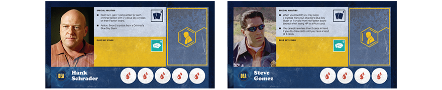 Breaking Bad est un jeu asymétrique, selon la faction que l’on joue la manière de jouer est différente, la DEA jouera forcement différemment des factions criminelles. Il va falloir bien gérer son truc en tant que criminel, car c’est facile de produire de la Blue Sky, car plus on produit de la Blue Sky et plus la DEA peut jouer de grosses cartes, faire des perquisitions, des flagrants délit, engager des fusillades … mais cela vous permet à vous aussi de jouer de plus grosses cartes, toute la subtilité est là. Breaking Bad propose aussi de la négociation, puisque entre factions criminelles vous allez pouvoir profiter des labo des autres, surtout quand il y a eu des perquisitions, mais occuper un labo adverse veut aussi dire, produire de la Blue Sky aussi pour les adversaires, donc il va falloir la jouer fine, trahir, profiter, négocier, et profiter de temps à autres des bons services du bon Saul Goodman.