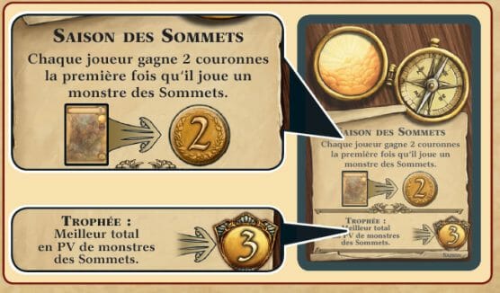 - Révéler une carte saison : la carte saison indique le type de monstre que le public veut voir, il y a donc un bonus à gagner dés que l’on place un monstre du type réclamé. A la fin de la saison le joueur qui aura le plus de monstres du type demandé prendra la carte saison qui lui rapportera 3 points de victoire en fin de partie.