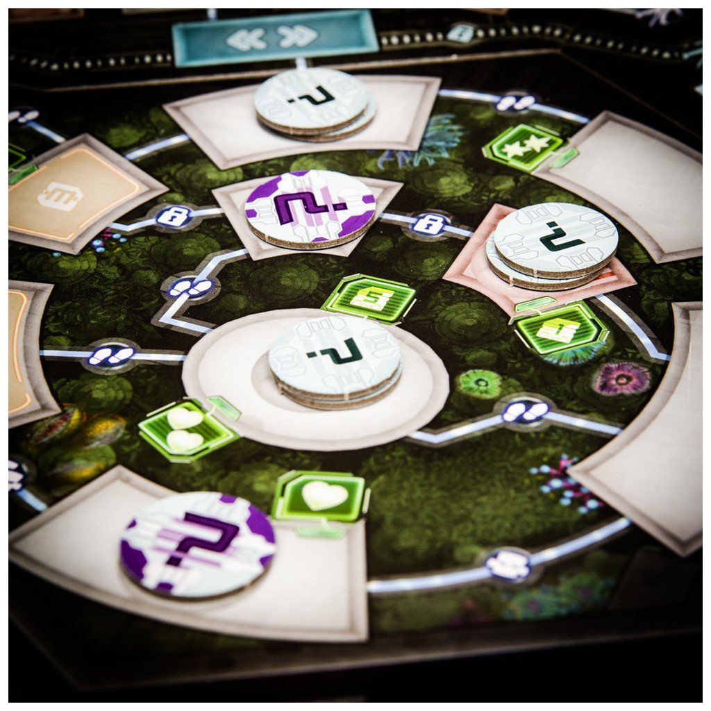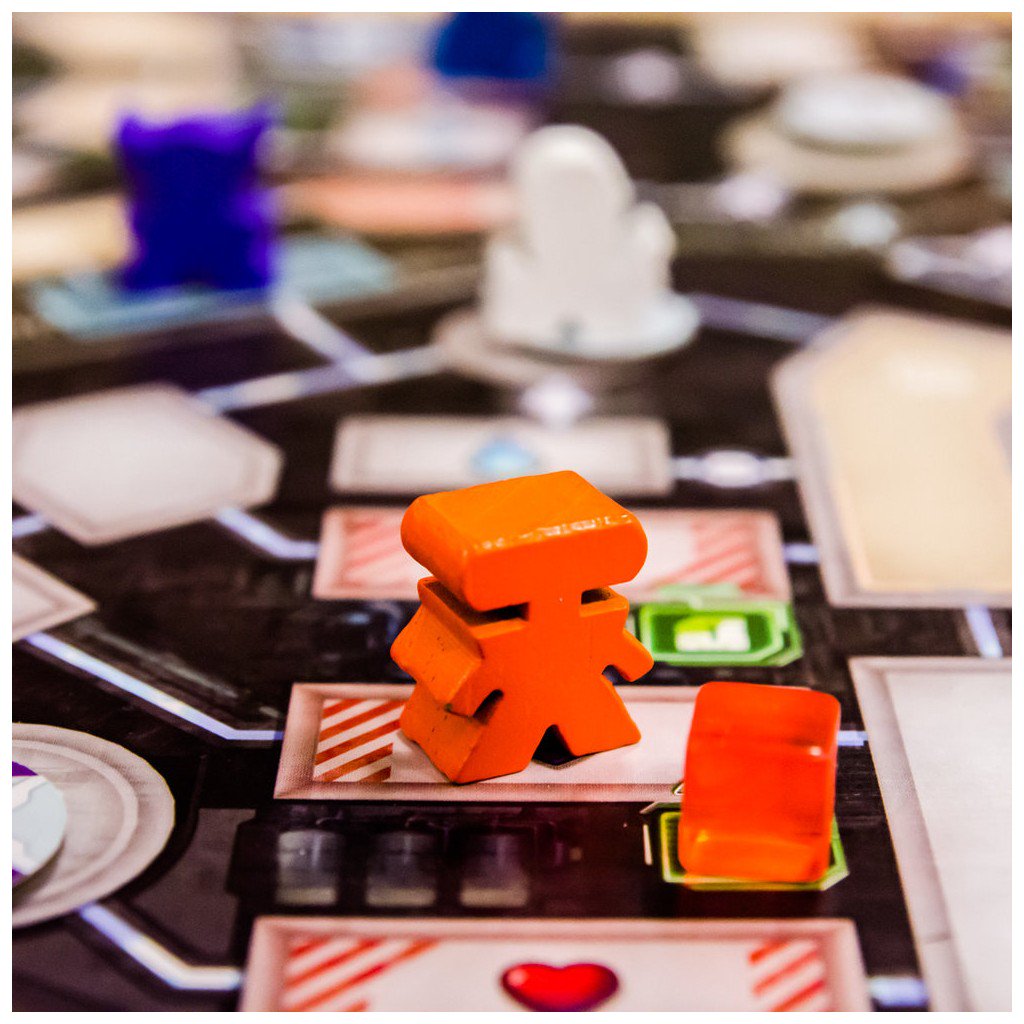 Autres nouveautés, et ces nouveautés se trouvent sur le plateau, ce sont les hyperstations, les téléporteurs et les centre de Data. Les hyperstations sont comme des tapis roulant, qui nous permettent de nous déplacer rapidement sur de longues distances. Et les téléporteurs permettent de nous téléporter mais pour cela il faut acheter un télépass sur le marché, et il n’y en a que 2. Les centres de Data sont à pirater, et ils sont les seuls moyens d’accéder à la salle des artefacts, pour se faire vous devez entrer dans un centre de Data et y placer un cube, vous devez placer 2 cubes dans 2 centre différents pour avoir un jeton code de commande.