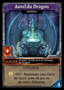 C’est que vous n’êtes pas seul dans les souterrains, le Dragon veille, et fait très souvent des dégâts. Durant votre expedition, vous allez générer du bruit, des Clanks, et quand vous achèterez des cartes donjons et qu’il faudra compléter la riviere de cartes visibles, si un symbole Dragon apparait sur une de ces carte, tout les cubes Clank générés iront dans le sac du Dragon. Selon le degré de colère du dragon, il faudra piocher des cubes dans le sac. Il se peut que vous tiriez des cubes noir, les cubes du Dragon, et la vous ne risquez rien, par contre si un cube de votre couleur est tiré, et bien c’est une blessure. Plus vous avancerez dans le jeu, moins il y aura de cubes noirs dans le sac, et et plus la colère du Dragons sera élevée, et plus vous serez exposé à sa colère. La colère du Dragon augmente à chaque fois qu’un joueur découvre un œuf de Dragon, et chaque fois qu’un Artefact est pris.