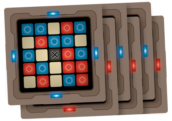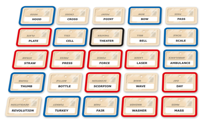 On place tout d’abord 25 cartes nom de code au centre de la table, on forme 2 équipes (selon le nombre de joueur bien sur) et on désigne 2 maitres espions. Les 2 maitres espions se mettent du même coté de la table, les autres joueurs sont donc en face. Les maitres espions piochent une carte « clé » et eux seuls y ont accès. La carte « clé » indique la position des mots que chaque espion doit faire deviner à son équipe. Donc en bleu, ce sont les informateurs bleu, qu’il faut faire deviner à son équipe, même chose pour les rouges. Les emplacement beige sont des témoins, ils sont juste là pour nous faire perdre du temps. Et il y a l’assassin, en noir, si jamais par erreur, suite à un indice donné mal choisit, notre équipe tombe sur l’assassin, la partie est perdu.