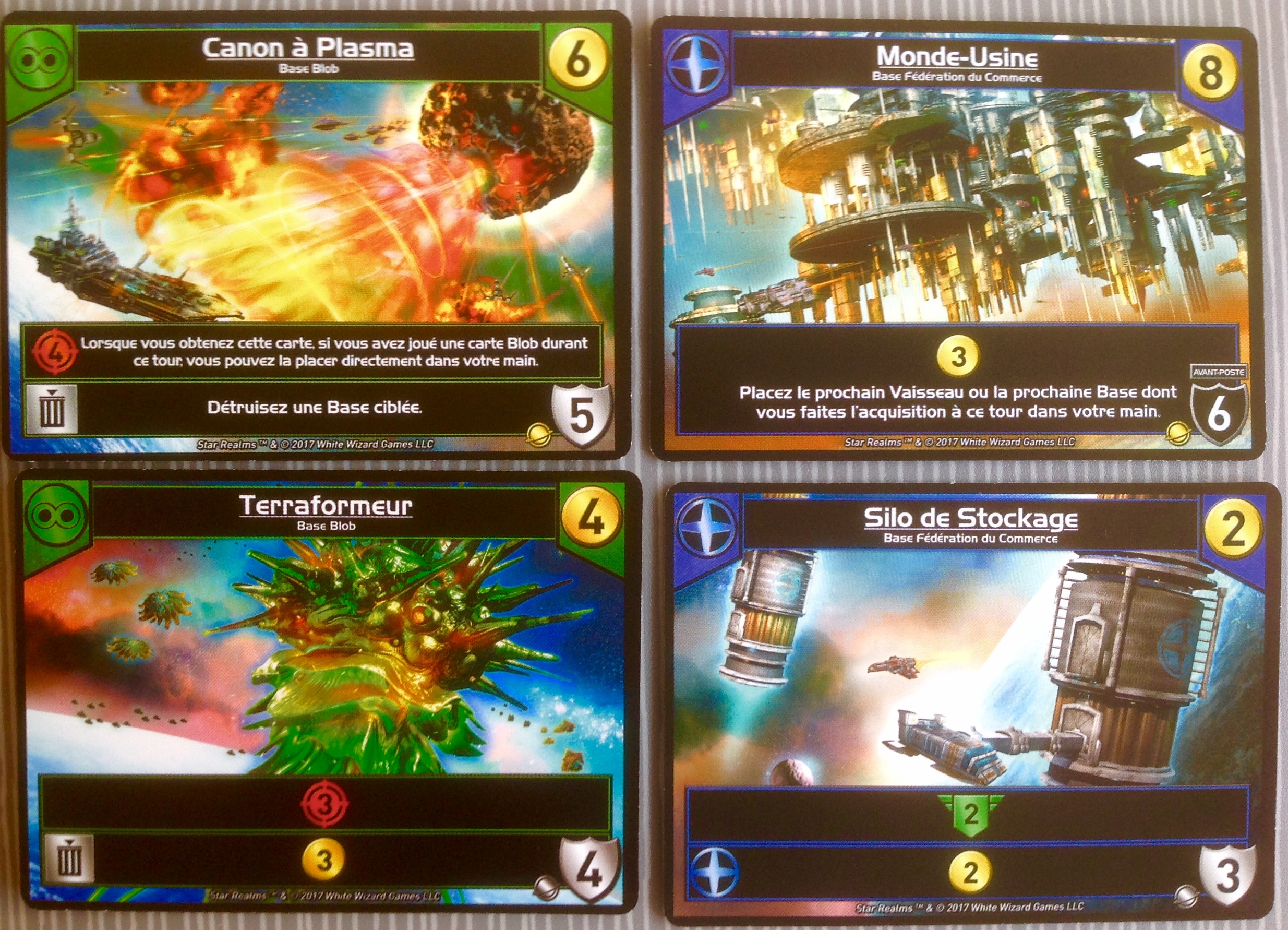 Sur le fond rien ne change, les caractéristiques de chaque faction restent les mêmes, mais les effets sont différents. Colony Wars introduit un peu plus la notion de choix entre 2 effets, il y a également des effets de cartes qui s’activent à l’achat et qui permettent de mettre une carte directement dans sa main. J’ai également remarqué qu’il y avait beaucoup d’effet qui permettaient de piocher de nouvelles cartes, encore plus que dans Star Realms.