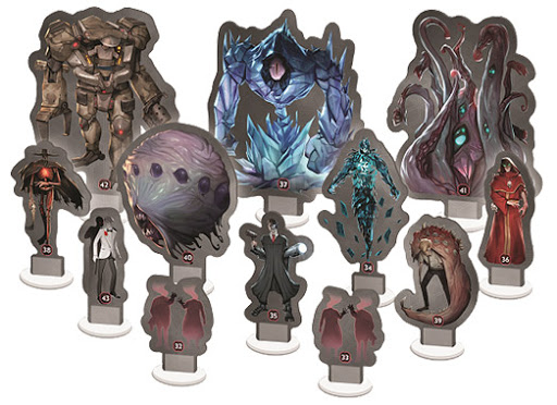 Pour faire court, la mécanique de jeu repose sur la gestion de dés. A votre tour vous allez piocher 5 dés, les dés blanc sont lancés de suite, et vont vous permettre de gagner des pions lucidité, qui permettent d’utiliser votre capacité spéciale, ou de faire une relance de dés. Ensuite les dés rouges servent au test de force et à l’attaque de mêlée, les dés vert à l’agilité et au tir à distance, les jaunes pour la fouille et les dés violet sont des dés bonus. Il reste les dés noir qui sont des dés de menace et qui servent à activer les ennemis.