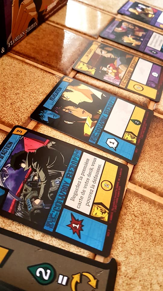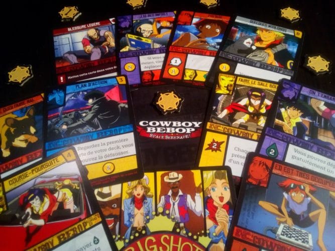 Cowboy Bebop – Space Sérénade sentait déjà très bon à la lecture des règles, et s’est révélé à la hauteur de mes attentes durant la partie, pour un Deck Building sous licence, il dépasse très largement Saint Seiya, que j’ai trouvé trop déséquilibré. Cowboy Bebop – Space Sérénade fonctionne parfaitement, il n’y a pas de frustrations, juste du plaisirs, et le matériel est tellement beau que l’on pourrait juste l’installer sans y jouer (même si ça serait vraiment dommage).
