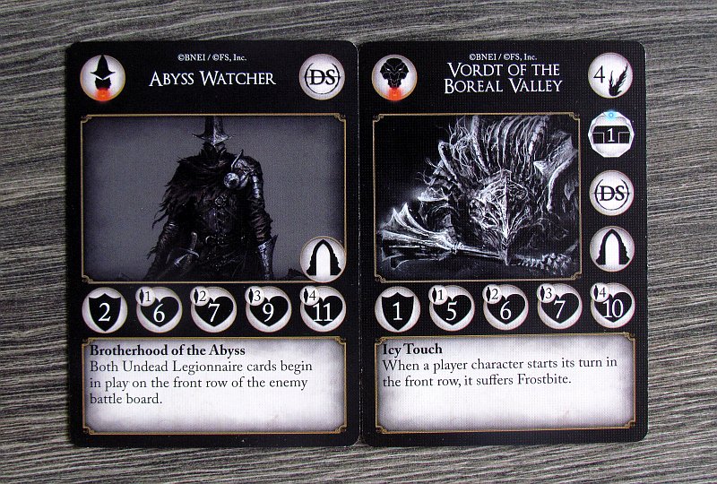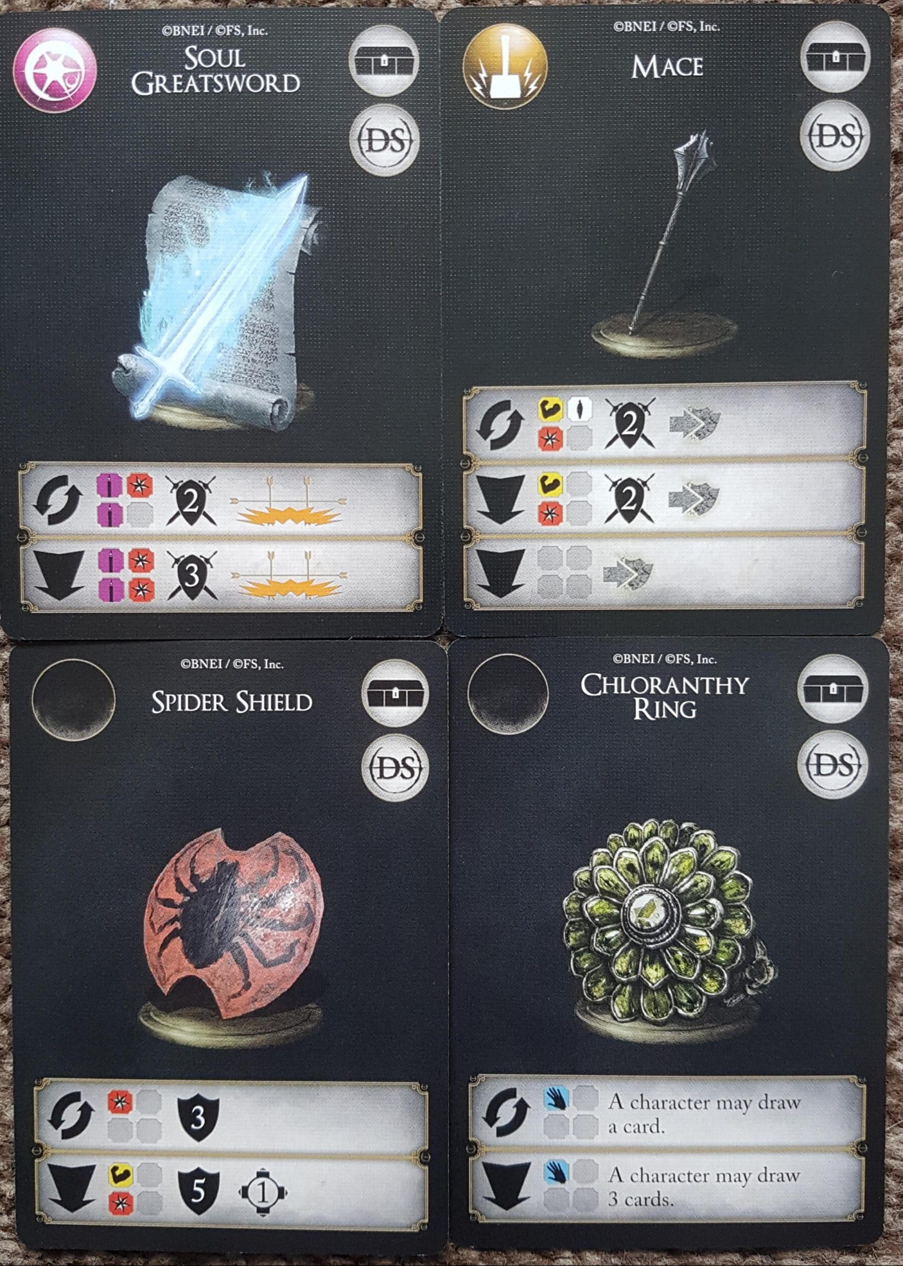 Les personnages n’ont pas de points de vie à proprement parlé, lorsque vous prenez des dégâts, vous devez défausser des cartes de votre main ou de votre pioche, sachant que si vous ne pouvez plus piocher votre personnage meurt, et vous allez au feu de camp et vous perdez tout ce que vous aviez gagné lors des rencontres précédentes. Car dans Dark Souls The Card Game, comme dans le jeu vidéo, chaque ennemi tué vous rapporte des âmes, et les âmes permettent d’acheter de nouvelles cartes afin d’améliorer votre deck. Il est donc important d’aller régulièrement au feu de camps, afin de vous soigner complétement et de récupérer les trésors et les âmes gagnées. Mais il ne faut pas abuser du feu de camps, car plus vous y allez et plus il s’éteint, vous ne pouvez y aller que 5 fois dans la partie.