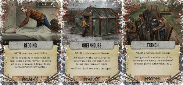 Le premier module offre la possibilité d’améliorer le quotidien de la colonie, que ce soit en terme de confort, de défense … Il suffit de poser des jetons développement sur les cartes amélioration. Dès qu’il y a autant de jetons développement que demandé sur la carte amélioration, vous prenez possession de cette amélioration.