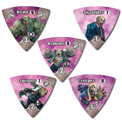 - Déplacer les zombies : comme dans tout jeu de zombie, les zombies sont attirés par le bruit et la vue de l’humain à la chair fraiche. Ce que l’on peut dire c’est qu’ils voient loin les bougres, puisqu’ils peuvent voir la moitié du plateau depuis l’endroit ou ils se trouvent. Si les survivants sont dans la cabane, les zombies avancent vers la cabane, et sinon ils vont vers le personnage le plus proche d’eux. Certains zombies sont plus rapides que d’autres, certains on du mal à se trainer … il y a 5 sortes de zombies différents et chacun ont leur particularité.