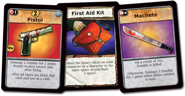 - Combattre les zombies : en plus d’avoir la possibilité de shooter du zombie lors de votre tour de jeu, si après un déplacement de zombie vous êtes dans la même case, vous ne prenez pas bêtement une blessure, vous vous débattez. Vous avez la possibilité de vous battre avec une arme au corps à corps en votre possession. Les combats se résolvent avec des dés, il suffit de lancer 2 dés, et de comparer la valeur de votre lancé à la valeur de combat du zombie. Si la valeur de votre jet de dés est supérieur à la force du zombie, vous lui infligez une blessure. Par contre si c’est le contraire, le personnage choisit de perdre l’arme avec laquelle il s’est battu, ou prendre une blessure. Sachant que la troisième blessure est mortelle et vous devenez vous même une zombie et vous réagissez comme vos congénères (cerveaux !!!!).