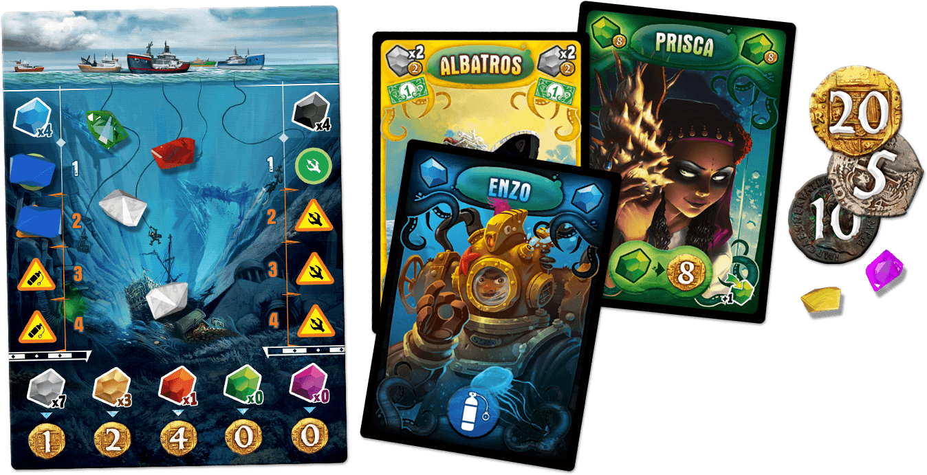 - Plonger : cette action est le cœur du jeu, c’est ce que qui va vous permettre de gagner des points. lorsque vous décidez de plonger, dans un premier temps, vous devenez le chef de plongée et les joueurs qui sont sur des tuiles adjacentes peuvent, s’ils le souhaitent, vous rejoindre sur votre tuile pour participer à la plongée. Le chef de plongée prend donc le plateau plongée et va piochez dans le sac en tissu une gemme. La c’est du « stop ou encore » le chef de plongée peut décider d’arrêter ou de continuer. En piochant des gemmes on peut tomber sur des gemmes bleu ou noir, bleu pour l’oxygène, soit pour les créatures sous marines. Au bout de la deuxième gemme bleu, il faut pouvoir jouer de sa main une carte oxygène, sinon vous manquez d’air et vous êtes obliger de remonter à la surface, et du coup de laisser les trésors. Même chose pour les gemmes noir, sauf qu’il faut jouer une carte combat (noir) pour continuer la plongée. Lors d’une plongée, vous et les autres plongeurs, avez la possibilité de jouer des cartes de votre main afin de gagner des points, de modifier la valeur des gemmes… La plongée prend fin de 2 façons différentes, soit le chef de plongée décide d’arrêter de piocher des gemmes, et dans ce cas, lui et les autres plongeurs gagnent des points pour les trésors trouvés. Soit le chef de plongée est contraint de remonter faute dioxygène, ou une mauvaise rencontre, et les gemmes sont toutes perdues, seuls les points des cartes seront gardés.
