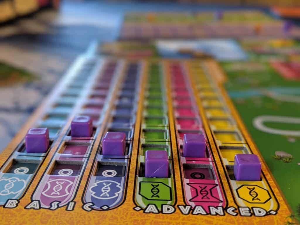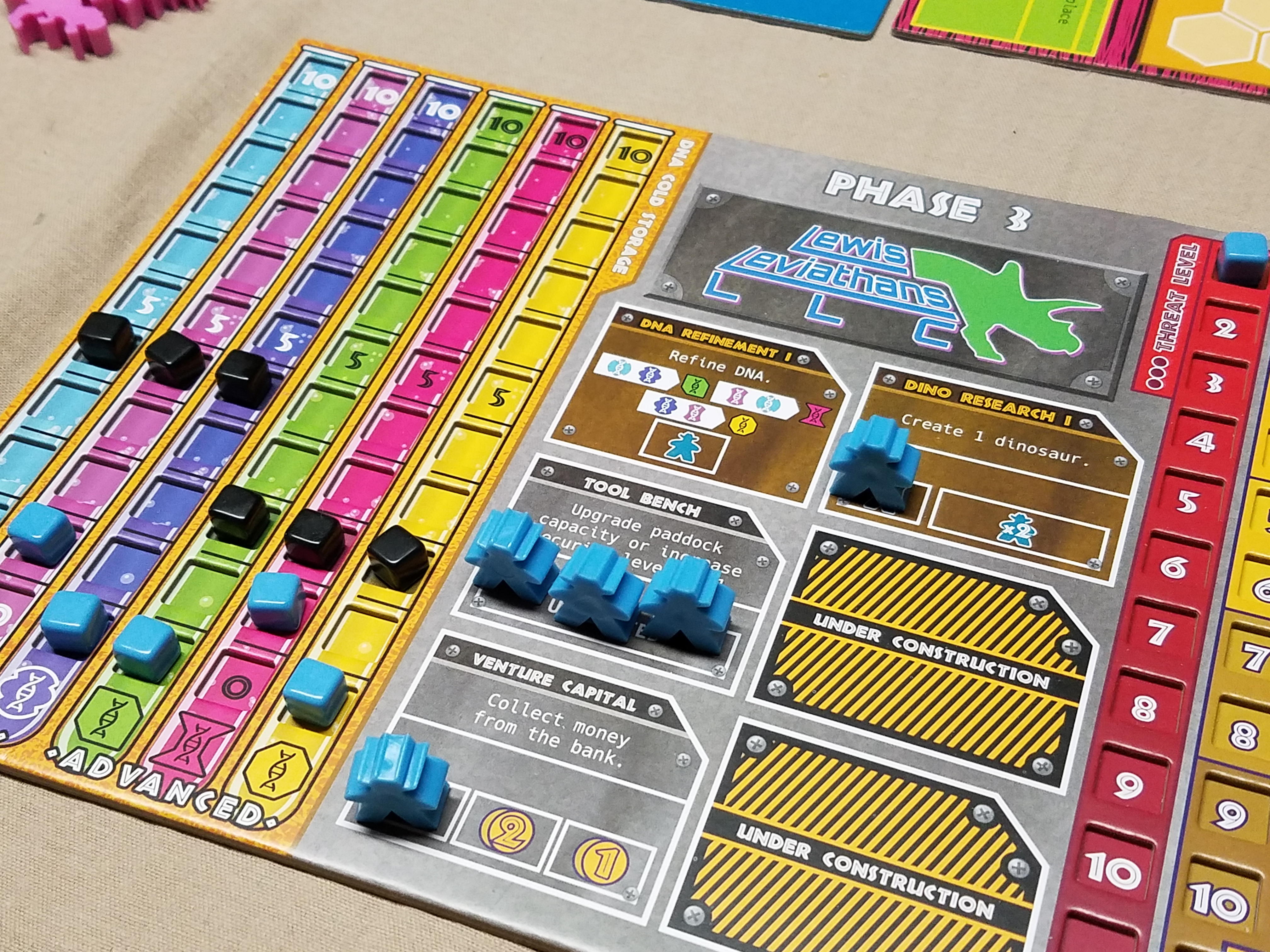 - Phase des ouvriers : comme dans un jeu de pose d’ouvriers, chaque joueur va simultanément assigner des ouvriers sur son plateau pour effectuer diverses actions. Vous allez donc pouvoir extraire de l’ADN avancé en échangeant de l’ADN de base, créer de nouveaux dinosaures, améliorer la sécurité de votre parc (et ça c’est hyper important), améliorer la capacité des enclos pour vos dino.