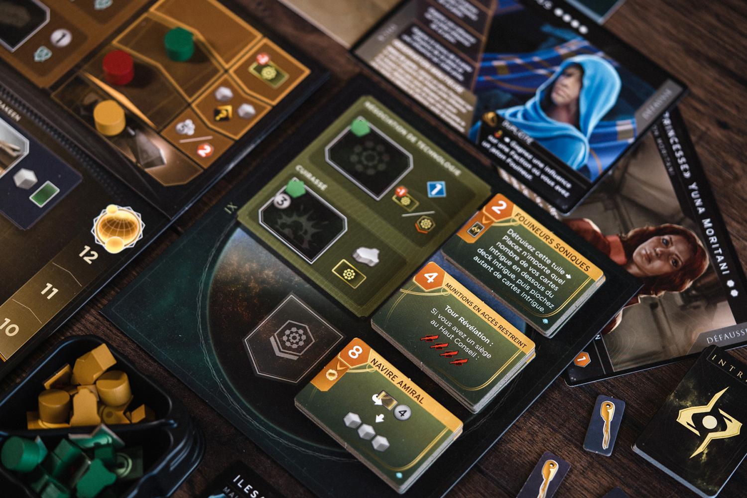 Dans cette extension il y a 2 petits plateaux, 4 nouvelles cartes conflit, 17 cartes intrigue, 32 carte imperium, 6 nouveaux personnages, 18 tuiles technologie… Donc pas de matos à foison, du coup la boite est très grande par rapport au contenu.