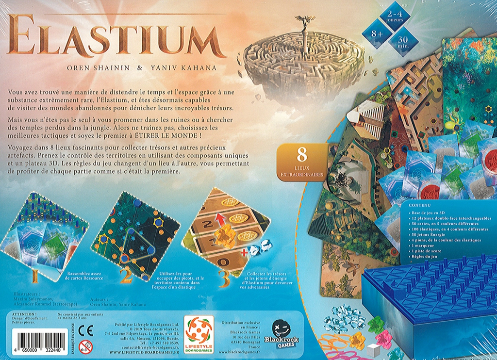 Elastium est un jeu de Oren Shainin et yaniv Kahana, édité par Lifestyle Boardgames et distribué par Blackrock Games, pour 2 à 4 joueurs, pour des parties de 30 minutes.