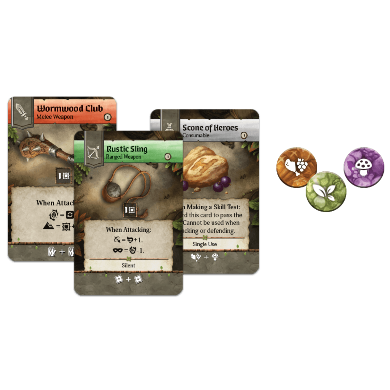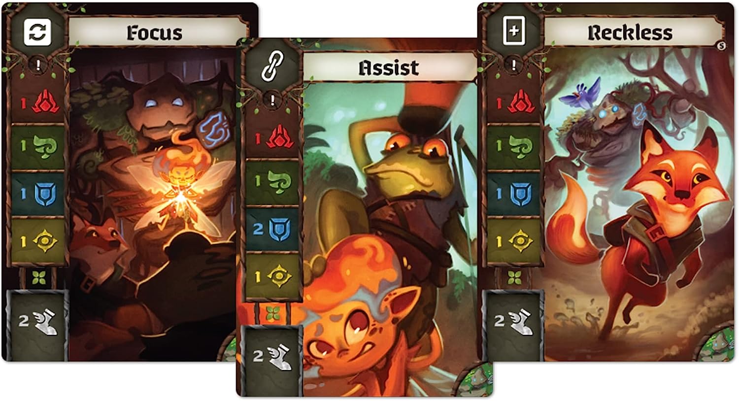 Familiar Tales se joue avec des cartes, au début de votre tour vous avez 5 cartes en main, et ces cartes ont différentes valeurs, il y a des valeurs de déplacement, d’attaque au corps à corps ou à distance, de défense… Donc durant votre tour vous allez utiliser ces cartes pour faire autant d’actions que vous le souhaitez tant que vous le pouvez. Ces cartes ont aussi des effets lorsque vous les jouez, comme gagner 1 point de vie, piocher une carte, relancer le dé…