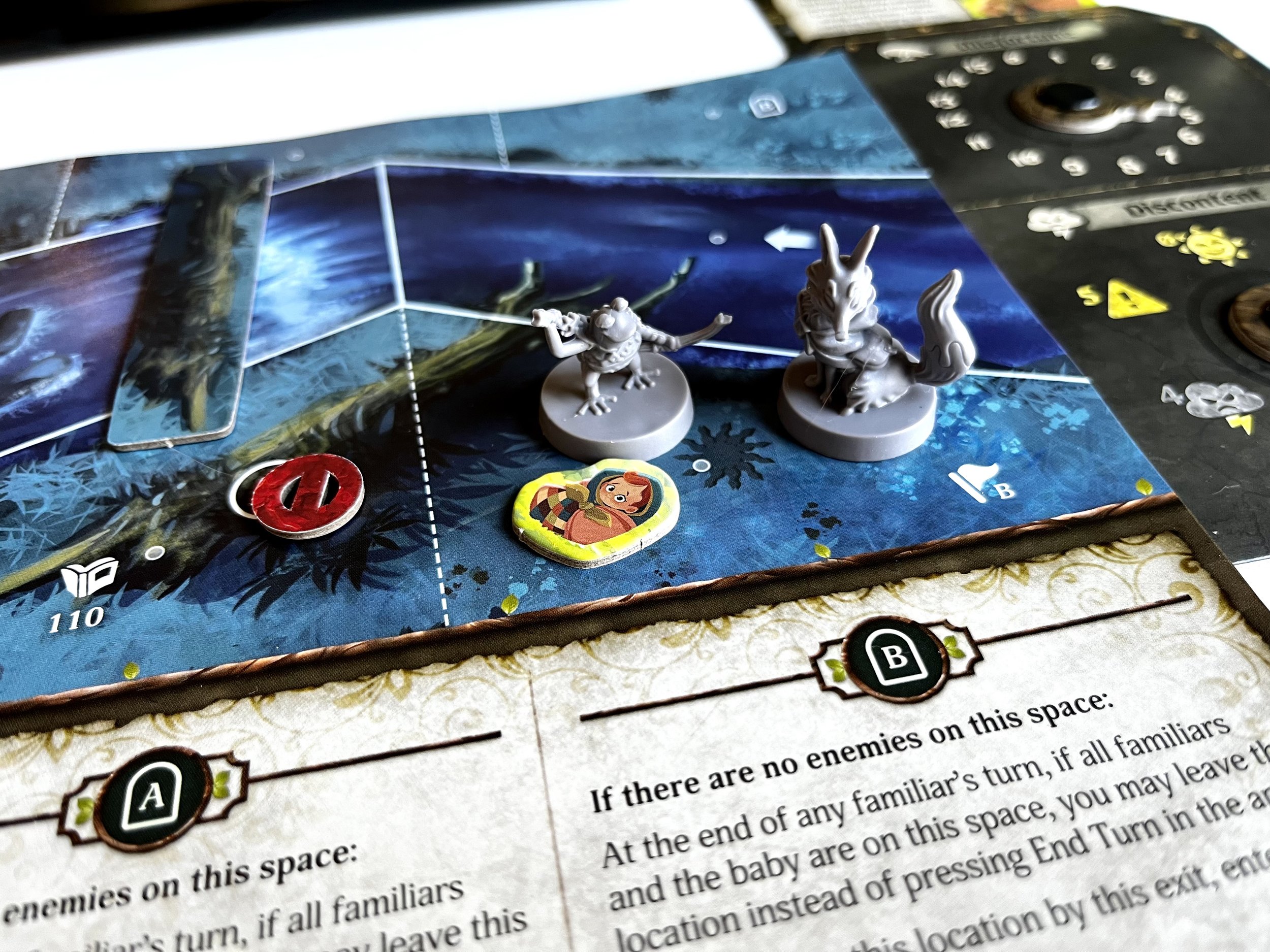 Lorsque vous attaquez un ennemi, vous devez en plus des cartes jouées, lancer le dé du destin, qui peut booster votre attaque, ou au contraire réduire votre attaque. Il y a tout un action d’action possible à faire, et une en particulier est très importante c’est s’occuper de l’enfant, car dans Familiar Tales vous allez trimballer un enfant tout au long du jeu, et il va falloir bien s’en occuper, et surtout gérer sa contrariété.