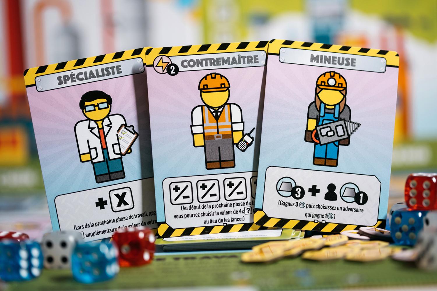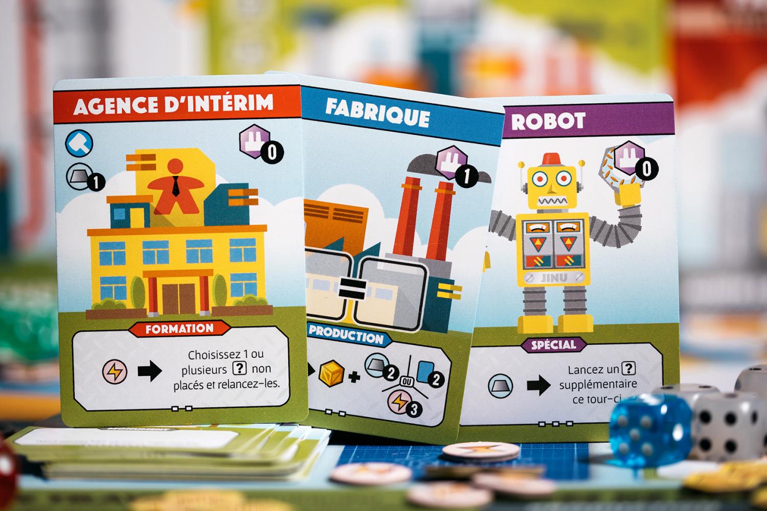 - Phase de travail : durant cette phase vous lancer vos dés, les assigner aux différents secteurs de votre siège social ou à des cartes bâtiment, pour produire des ressources, prendre de nouvelles cartes plan… Ces ressources vous permettront de bâtir de nouveaux bâtiments avec vos cartes plan. Pour bâtir une carte, il faudra défausser une carte de votre main ayant la même icône outil, et payer le coût en ressource de la carte. Ces nouvelles cartes vous permettent de produire plus, de gagner des jetons marchandises (points de victoire), de modifier des dés… et ces cartes rapportent aussi des points de victoire. Vous ne pouvez construire qu’une carte de chaque exemplaire, sauf les monuments.