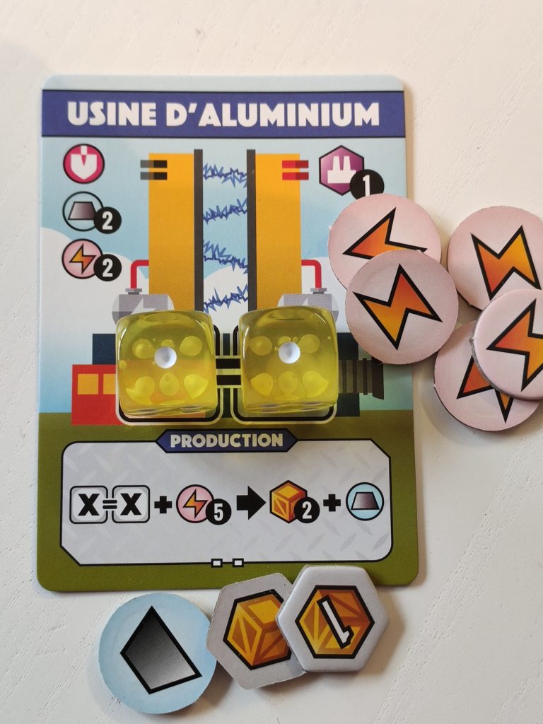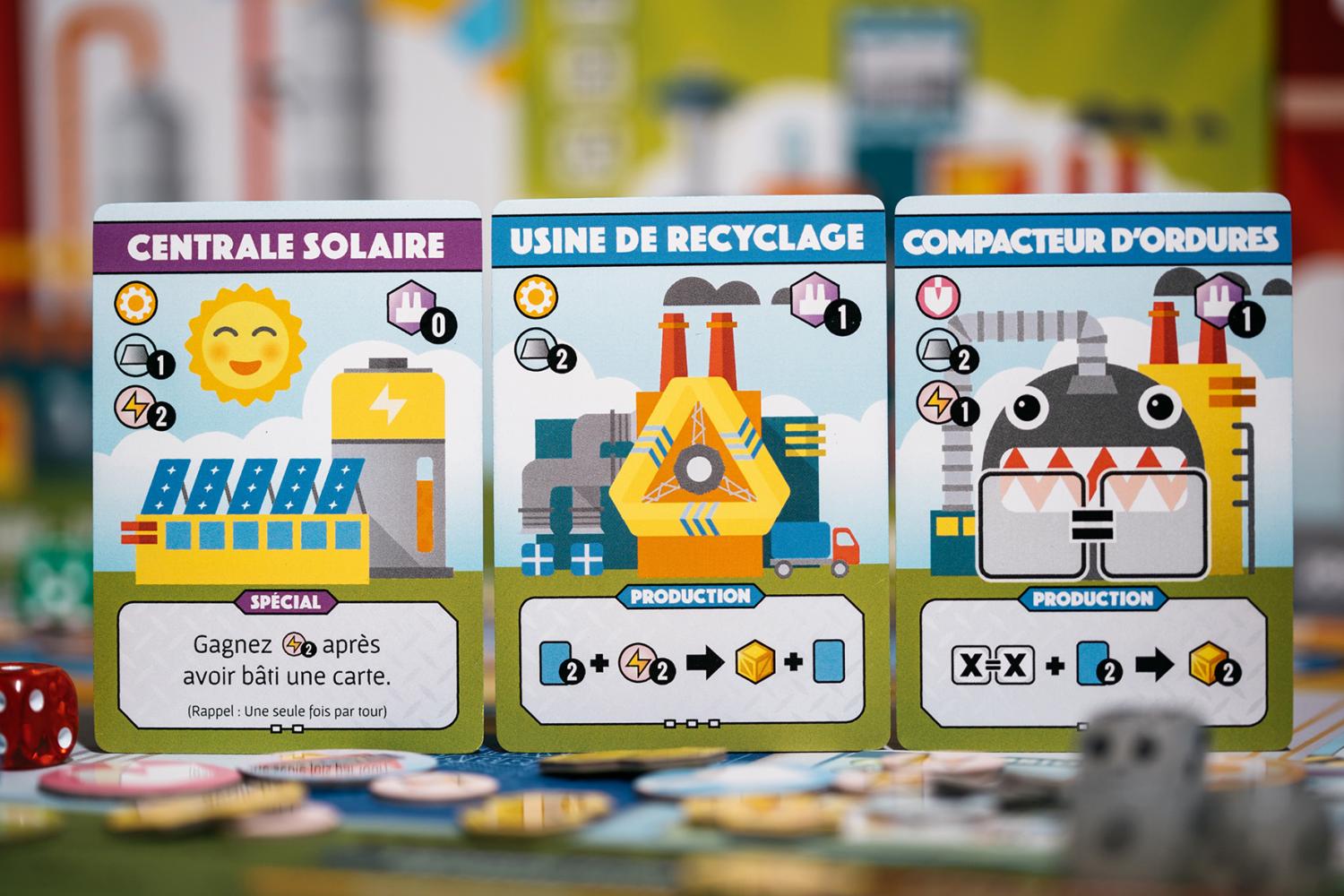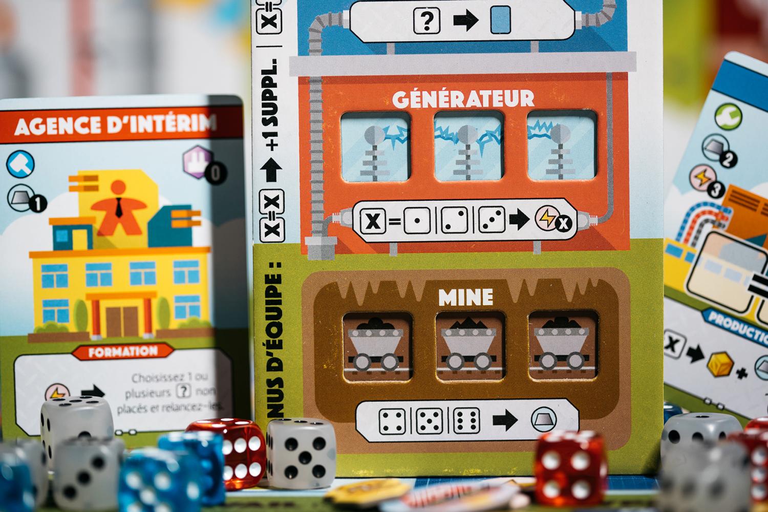 Fantastiques Fabriques est un « engine building » il va falloir construire les bonnes cartes pour produire le plus de ressources possibles, pour construire des bâtiments qui produisent des jetons marchandise, et donc marquer le plus de point. Le hasard est bien sur présent car il y a des dés à lancer, mais les résultats des dés peuvent être modifier avec certaines cartes bâtiment ou prestataire. Il est aussi possible de produire plus de ressources avec votre plateau siège social, en assignant des dés de même valeur à un secteur (2 dés identiques = 1 ressource supplémentaire). Il faudra aussi prendre pas mal de cartes, car je le rappelle, pour construire il faut défausser une carte avec le même outil, donc c’est un élément à anticiper pour éviter de se retrouver coincé à ne pas pouvoir construire la carte que l’on voulait.