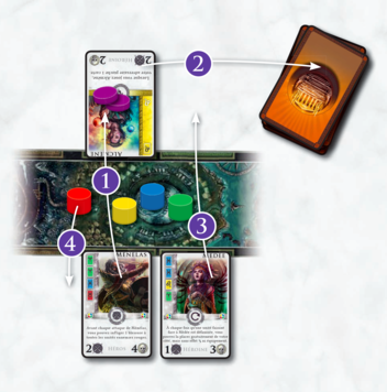 • Attaquer : toutes les unités en jeu attaquent sur l’emplacement situé en face d’elles, si il y a des unités adverses les unités prennent des blessures ou meurent et sont ensuite défaussées. S’il n’y a personne en face, selon la zone du plateau les effets sont différents. Il y a 3 zones sur le plateau, l’Olympe, Delphes et Troie, sur l’Olympe vous recevez 1 point de victoire, sur Delphes vous prenez un pion de couleur qui pourra remplacer une carte pour payer le coût d’une carte, et sur Troie, vous piochez une carte.