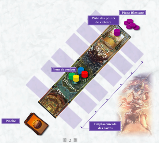 Fight for Olympus est un jeu d’affrontement à base de carte, la mise en place est donc simple, on place le plateau au centre avec les pions blessures, les pions de couleur et le pion de points de victoire, les 2 joueurs piochent 6 cartes et vous êtes prêt.
