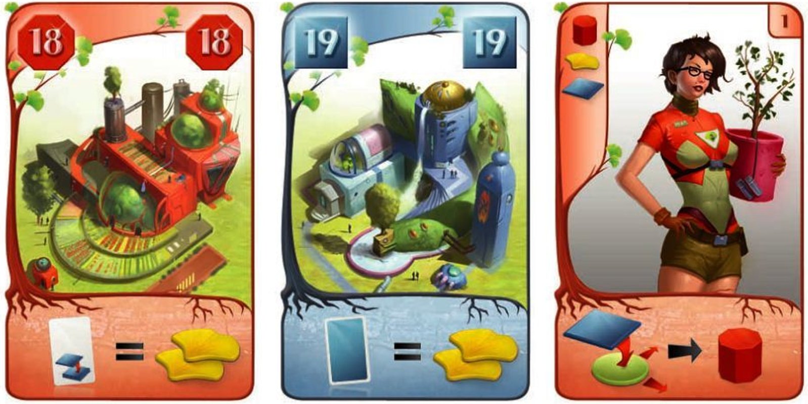 - En jouant une carte seule, vous exploitez. Si c’est une carte urbanisation, vous gagnez soit une ressource, soit une tuile bâtiment. Si vous jouez une carte bâtiment, vous exploitez le bâtiment du plateau qui correspond à votre carte. Si c’est une carte rouge, vous prenez une ressource, une bleu pour une tuile, et une jaune pour des points de réussite. Le nombre d’éléments gagnés dépend du nombre de bâtiment empilés, donc s’il y a 3 étages, vous gagnez 3 éléments.