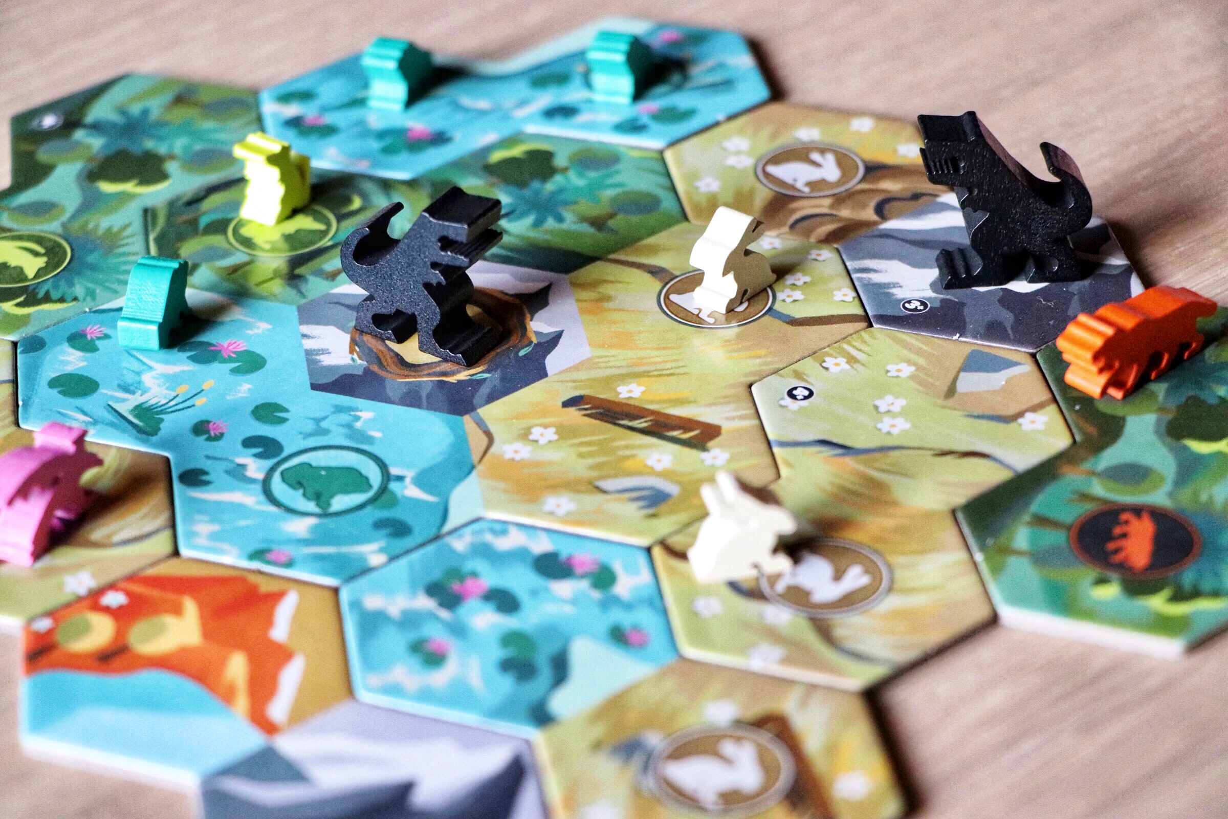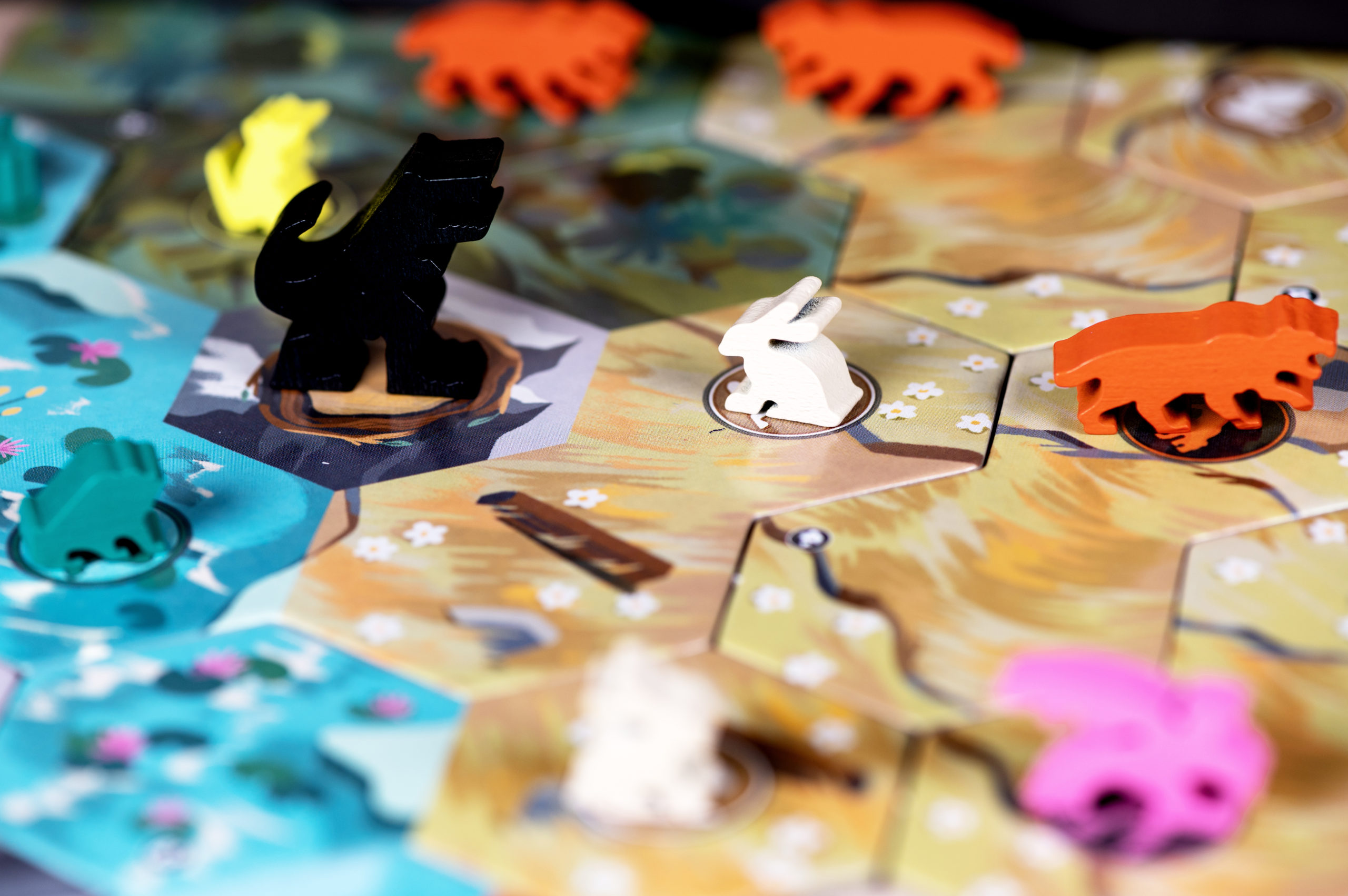 Si, lorsque vous prenez une tuile, vous prenez la dernière de la colonne, tous les joueurs vont activer les animaux qui correspondent à l’espèce qui est indiqué en bas de la colonne qui vient d’être vidée. Les espèces agissent différemment selon si c’est des proies ou des prédateurs. Chaque proie va se reproduire une fois sur un terrain vide adjacent qui correspond à son type de terrain, si une proie ne peut pas se reproduire, elle ne se reproduit pas.