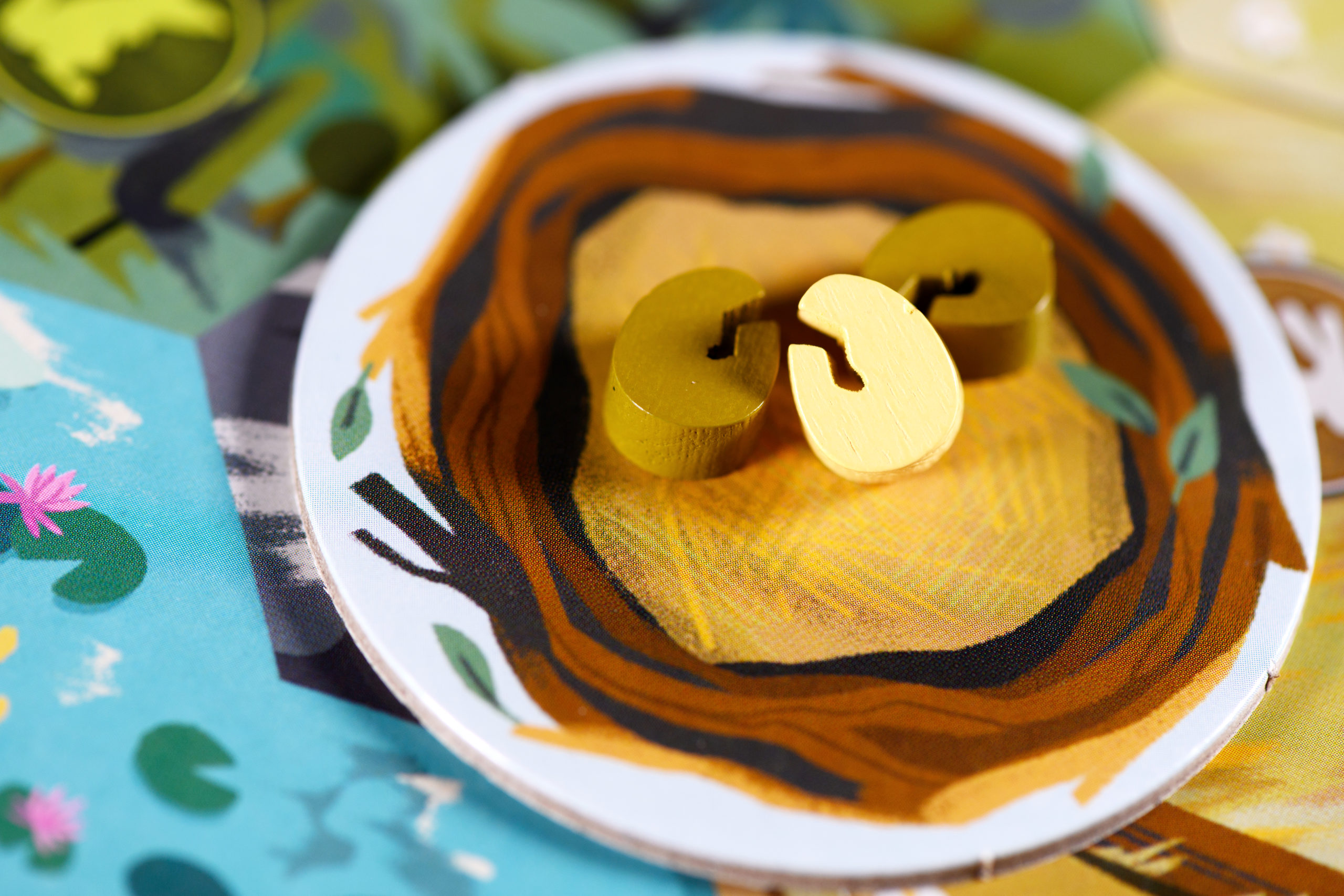Dans cette boite de on trouve un plateau animaux, 5 tuiles de départ, 84 tuiles écosystème, 5 tuiles nid, 160 pions animaux, 45 pions œufs, de tout étant de très bonne qualité. Les illustrations ne portent que sur les paysages de tuiles, donc rien de bien extraordinaire, mais c’est suffisamment jolie pour le faire remarquer et c’est signé Gica Tam.