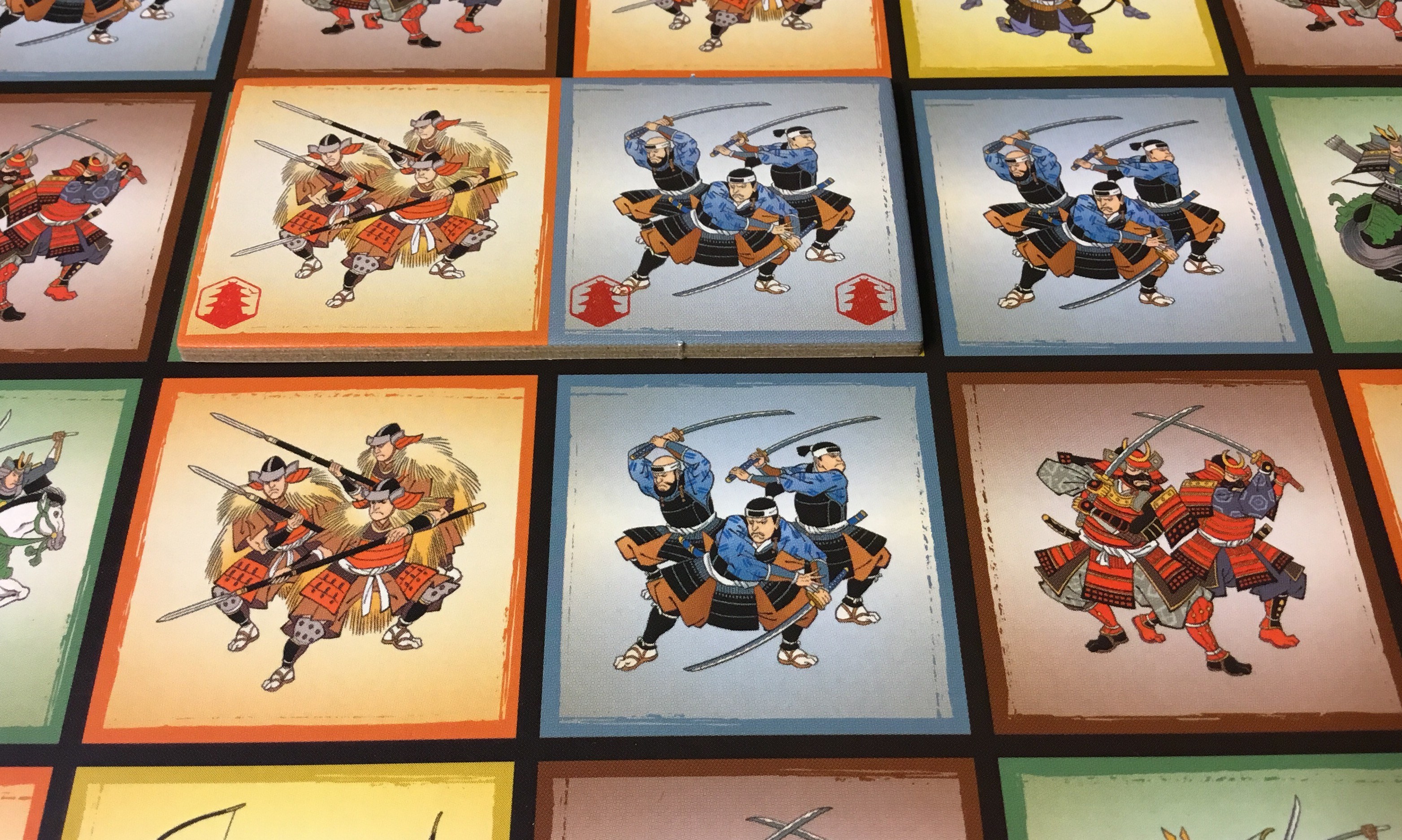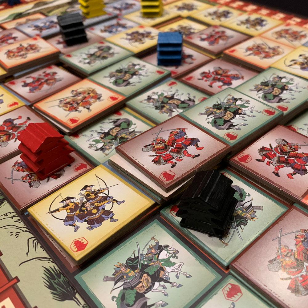 La mise en place est simple, on place le plateau au centre de la table (normal), on place les tuiles bannière sur le plateau, chaque joueur choisi un Daimyos, ensuite on place son marqueur honneur sur la piste des points, et on place les forteresses sur le plateau. Puis chaque joueur va constituer son armée, en prenant 3 grandes tuiles armée et 5 petites, 1 de chaque unité.